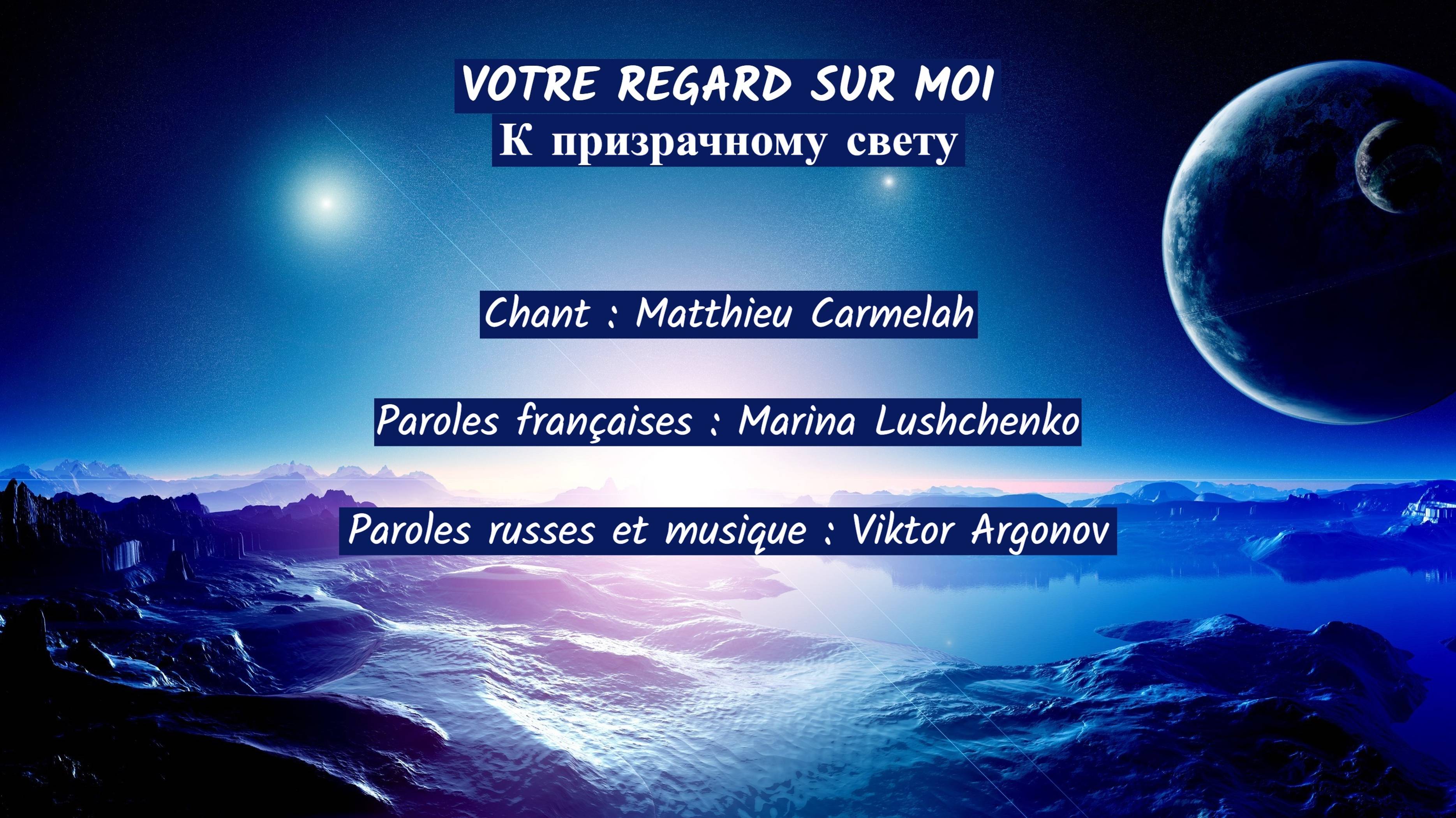 « Votre regard sur moi », adaptation française d’une chanson d’opéra techno russe. «К призрачному свету», французская версия песни из техно-оперы «2032: Легенда о несбывшемся грядущем» (Виктор Аргонов Project) Paroles françaises : ©Marina Lushchenko Перевод на французский язык: ©Марина Лущенко Mon site Web / Мой сайт: www.chansonrusse.fr VOTRE REGARD SUR MOI Ombres et lueurs astrales L’océan céleste, immense, devant moi s’étale Je vole dans un labyrinthe De rêves éphémères vers une lumière Là, je retrouve le jour Où votre regard sur moi s’est posé, si triste Et depuis je sais que pour moi Plus rien n’est pareil, sans vous rien n’existe À cet instant, un seul pas nous sépare Pris de vertige, dans vos yeux je m’égare Moi, j’ai aucune idée de ce qui nous attend Je voudrais seulement que, jusqu’au bout des temps, Dure cet instant où, par hasard ou pas, Vos yeux m’ont fait croire à l’impossible Tout perd son importance Je n’ai qu’une envie : vous voir, même si à distance Vous voir et vous revoir me donne Au moins l’illusion de votre présence Mais ce n’était qu’un songe Songe où l’on s’est rencontrés comme par miracle Songe qui nous a rendus si proches Mais l’écran s’éteint, d’un geste implacable Et désormais je ne suis plus le même Vous ne saurez jamais que je vous aime Ma vie n’est qu’une attente quand vous n’êtes pas là Le souvenir de vous remplit mes rêves. Moi, Juste un point dans l’infini, hostile et flou, Mais pour moi vous êtes tout Entre mes doigts, comme le sable, Glisse le temps, le songe s’efface, on n’est plus ensemble Je ne peux rien y faire, hélas Vous êtes tellement loin… Vous êtes introuvable… К ПРИЗРАЧНОМУ СВЕТУ Ночь гаснущего лета Россыпями звезд горит в сумерках рассвета Я вновь лечу сквозь память снов В лабиринте грёз к призрачному свету Там снова тот же день… День, который ваш принес взгляд, и я узнала Что в мире до него тогда Просто ничего не существовало Но в этот миг только шаг между нами И поплывет у меня под ногами… Пусть я не знаю, что должно случиться Но я хочу, чтоб этот миг продлился, сквозь Бесконечность пролетел столетий, лишь Только видеть, что вы есть на свете Как я искала встречи… Встречи, о которой быть не могло и речи Сквозь сотни микросхем ваш взгляд Как звезда далек на пути на млечном Там был со мной лишь сон Сон, где мы так странно вдруг оказались вместе… Сон, образ довершивший ваш… Лишь погас экран в невесомом жесте Но в этот миг все не так, все иначе Пусть, может быть, ничего я не значу Но этот мир живет одним лишь вами В снах, озаряя небеса огнями Я – лишь песчинка бесконечности Но дня нет без вас для меня Всё. Время безвозвратно… В вечность унесет, и сон не вернуть обратно Что я могу поделать здесь? Вы так далеко, время беспощадно…