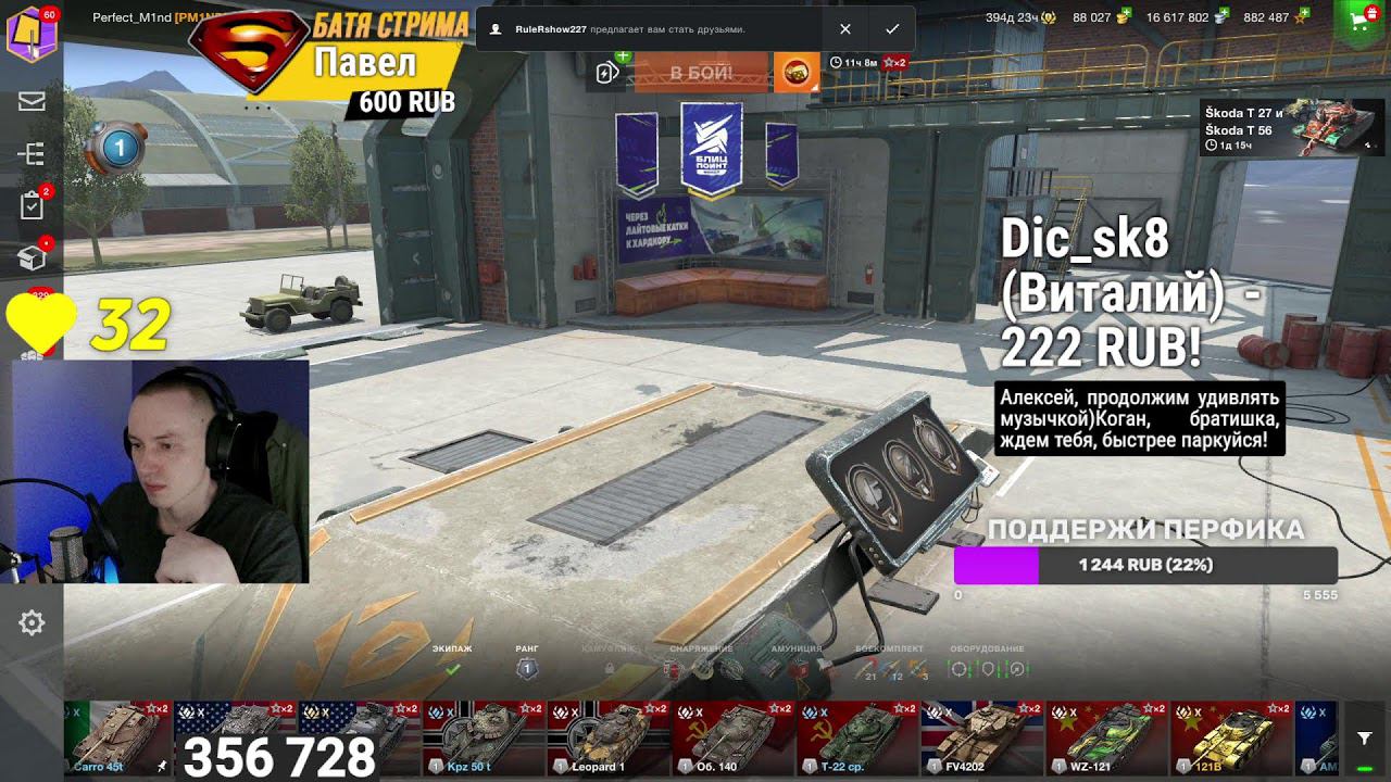 Поддержать канал, поставить музыку, чек статы, взвод и многое другое - https://www.donationalerts.com/r/pm1nd Если не получилось, пробуем здесь - https://donatepay.ru/don/pm1nd Канал с нарезками - https://www.youtube.com/@NeBlogerTanksBlitz Гайд как задонатить - https://youtu.be/LUzMMiJpQYg?si Телеграм - https://t.me/pm1nd взвод по братски - 1000р, 2-5 боев в рандоме (зависит от состояния рандома) выкатить танк по братски - 150р что-то другое по братски - от 1000р включить музыку громко (не забыть попросить в донате) - 1000р взять в клан без очереди и лишних вопросов 10000р #tanksblitz