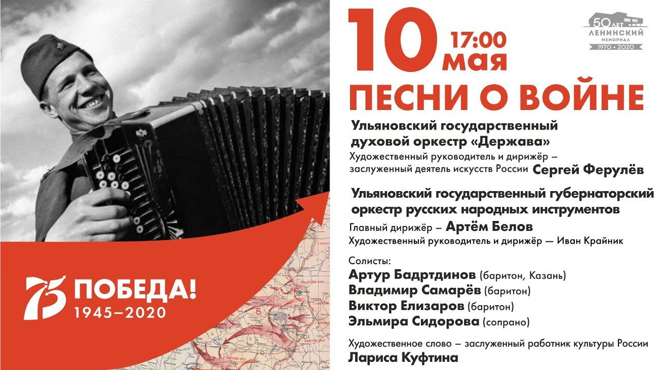 Ульяновский государственный духовой оркестр «Держава» Художественный руководитель и дирижёр – заслуженный деятель искусств России Сергей Ферулёв Ульяновский государственный губернаторский оркестр русских народных инструментов Художественный руководитель и дирижёр – Иван Крайник Главный дирижёр – Артём Белов Солисты: Артур Бадртдинов (баритон, Казань) Владимир Самарёв (баритон) Виктор Елизарова (баритон) Художественное слово – заслуженный работник культуры России Лариса Куфтина. В программе: песни и стихи войне, знаменитые военные марши, патриотические песни