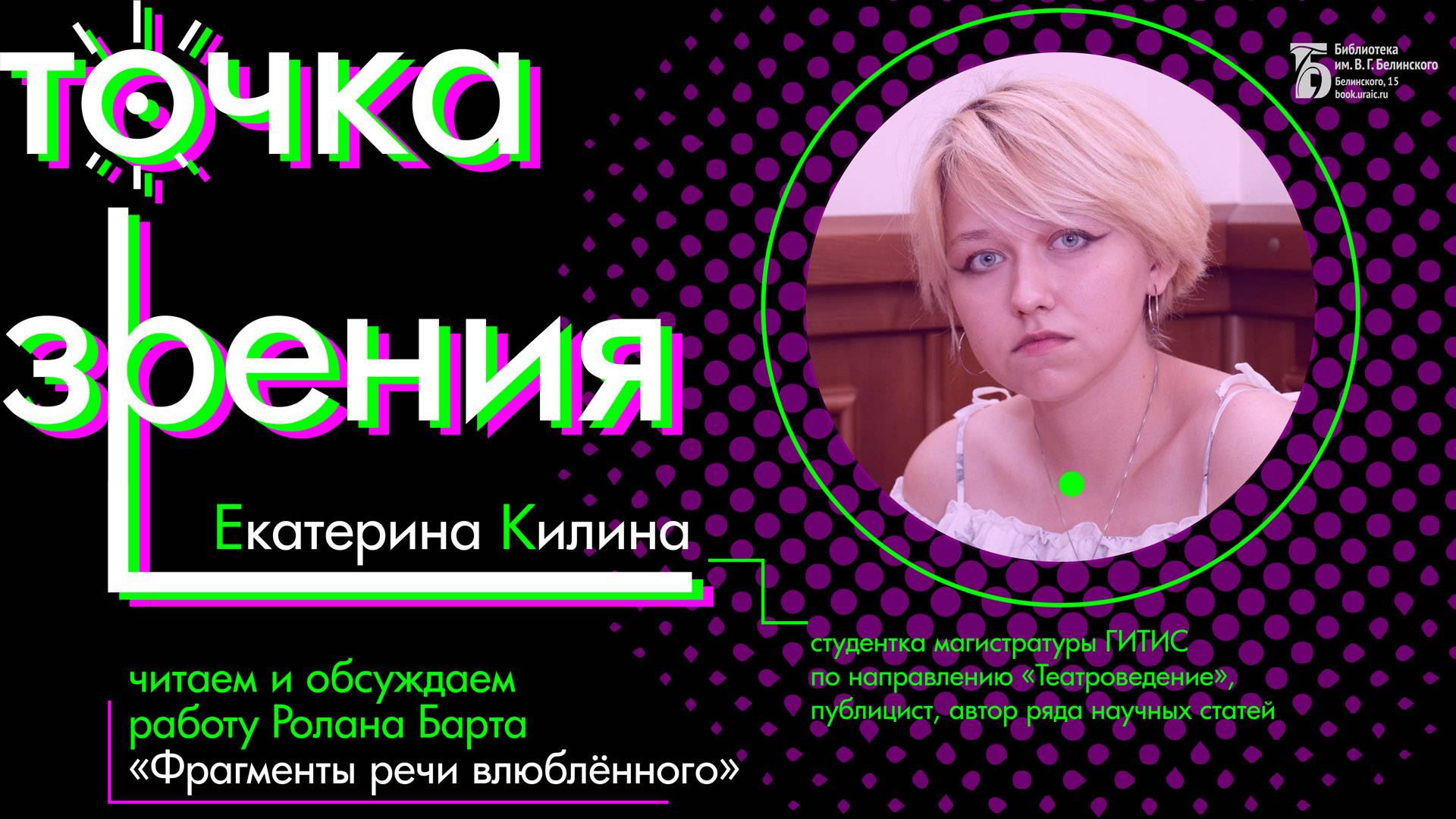 Спикер – Екатерина Килина, студентка магистратуры ГИТИС по направлению «Театроведение». «Фрагменты речи влюбленного» – текст философской природы. Чтение такого характера не терпит спешащих и неусидчивых. С точки зрения семиолога Барта, любовь – это то, что вызывает к жизни совершенно особую форму речи. Или скорее множество фигур и мест, организующие знаки в речь. Влюбленный почти всегда многословен, даже если молчит. Появление в мысли объекта любви не ведет к спокойному созерцанию прекрасного образа. Внутренний монолог в этом случае похож на маниакальную логорею, иногда перемежающуюся меланхолическими паузами. В новом выпуске проекта поговорим о том, как устроена книга. Постараемся понять, как согласно Барту сопряжены любовь, безумие и детство. Возможно ли дарить любовь и что для людей значит сама возможность произнести «я-люблю-тебя»? Камера, монтаж: Анна Порошина. Свердловская областная универсальная научная библиотека им. Белинского http://book.uraic.ru/ сайт https://vk.com/club6745014 VK