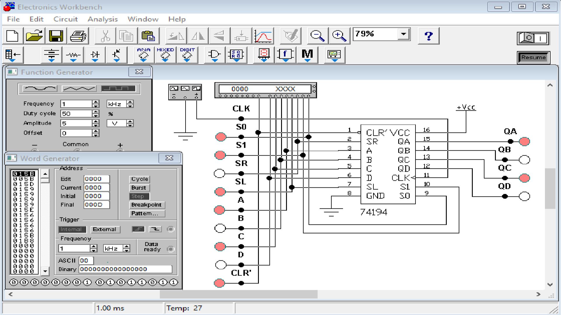 Исследование работы микросхемы универсального регистра в режимах параллельной записи и сброса..