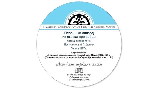 Песенный эпизод из сказки про зайца, теленгитский диалект, нотный пример № 15. Исполнитель А.Г. Калкин. Запись 1987 г. Опубликовано: Алтайские народные сказки. Новосибирск: Наука, 2002. 455 с. (Памятники фольклора народов Сибири и Дальнего Востока; т. 21).