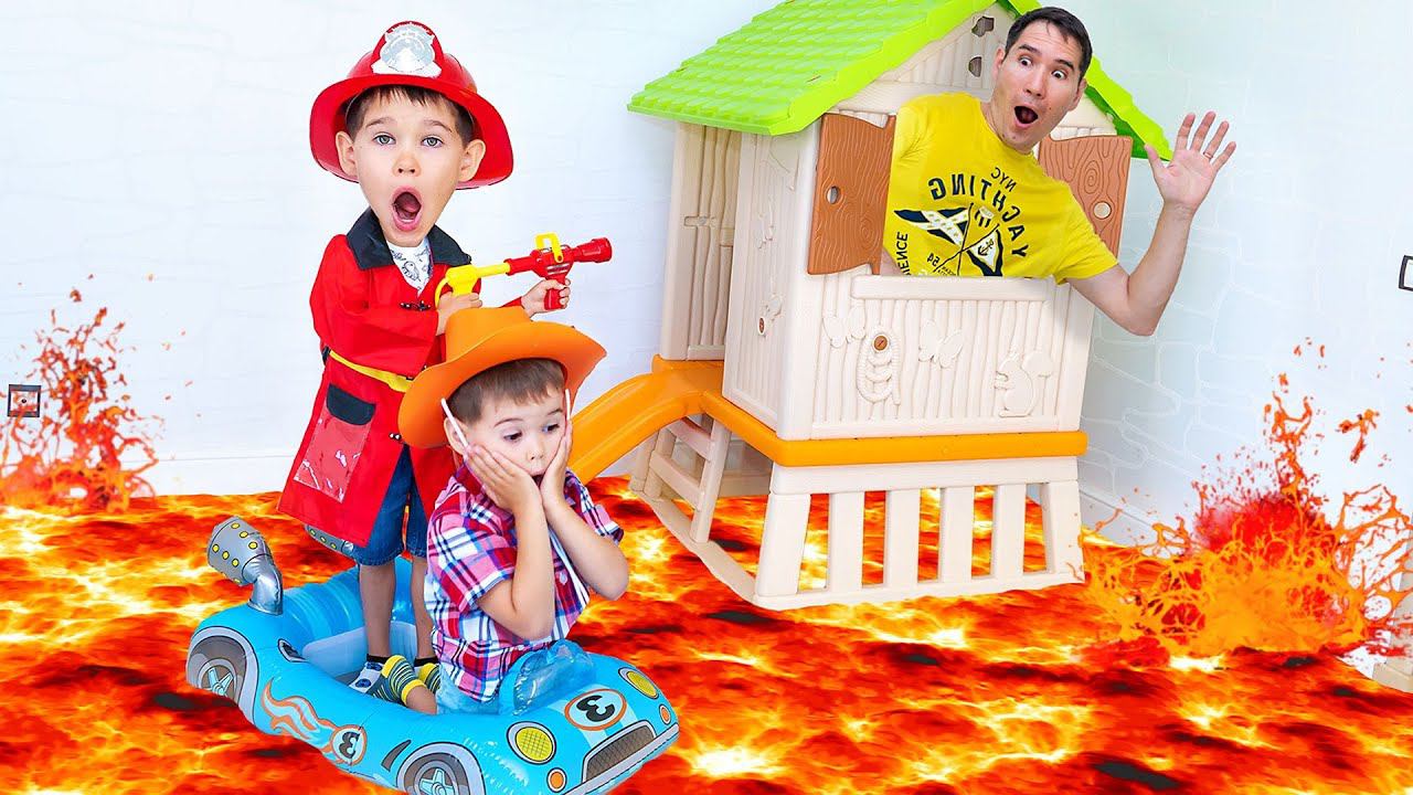 Дети играют с папой в игру «Пол – лава». Пол превратился в лаву. Папа уснул в игрушечном домике, когда пол превратился в лаву, и оказался в ловушке. Чтобы помочь отцу, Эрик и Глеб переплыли лавовую реку на надувной игрушечной лодке. Пожарный потушил дом и спас папу. Теперь папа может спать. Забавное видео для детей, творческая игра детей с родителями и игрушками. #ErikShow #ЭрикШоу ► Vkontakte: https://vk.com/erik_show