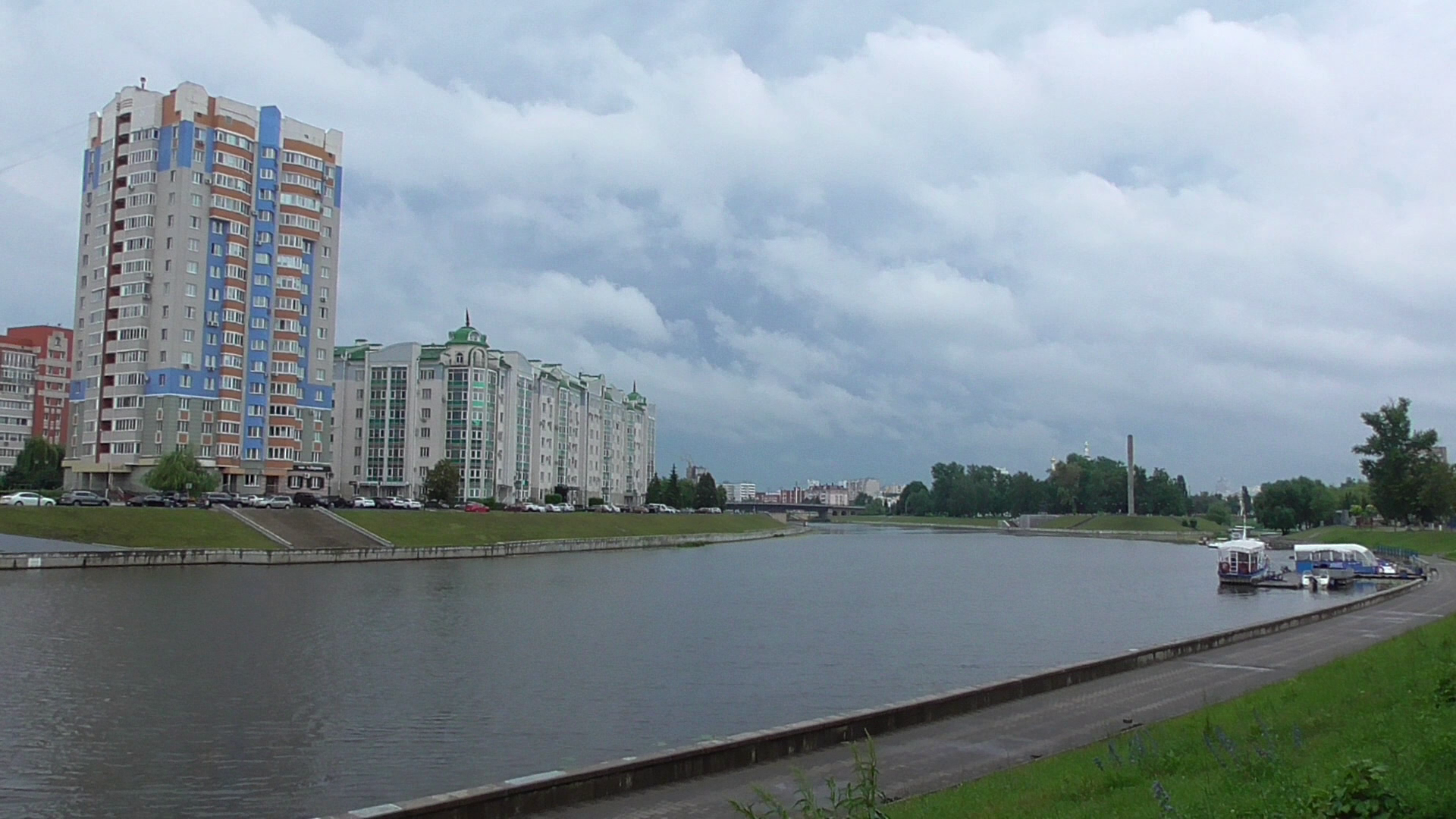 Пейзаж набережной: Набережная, река, дома. Небо и тучи