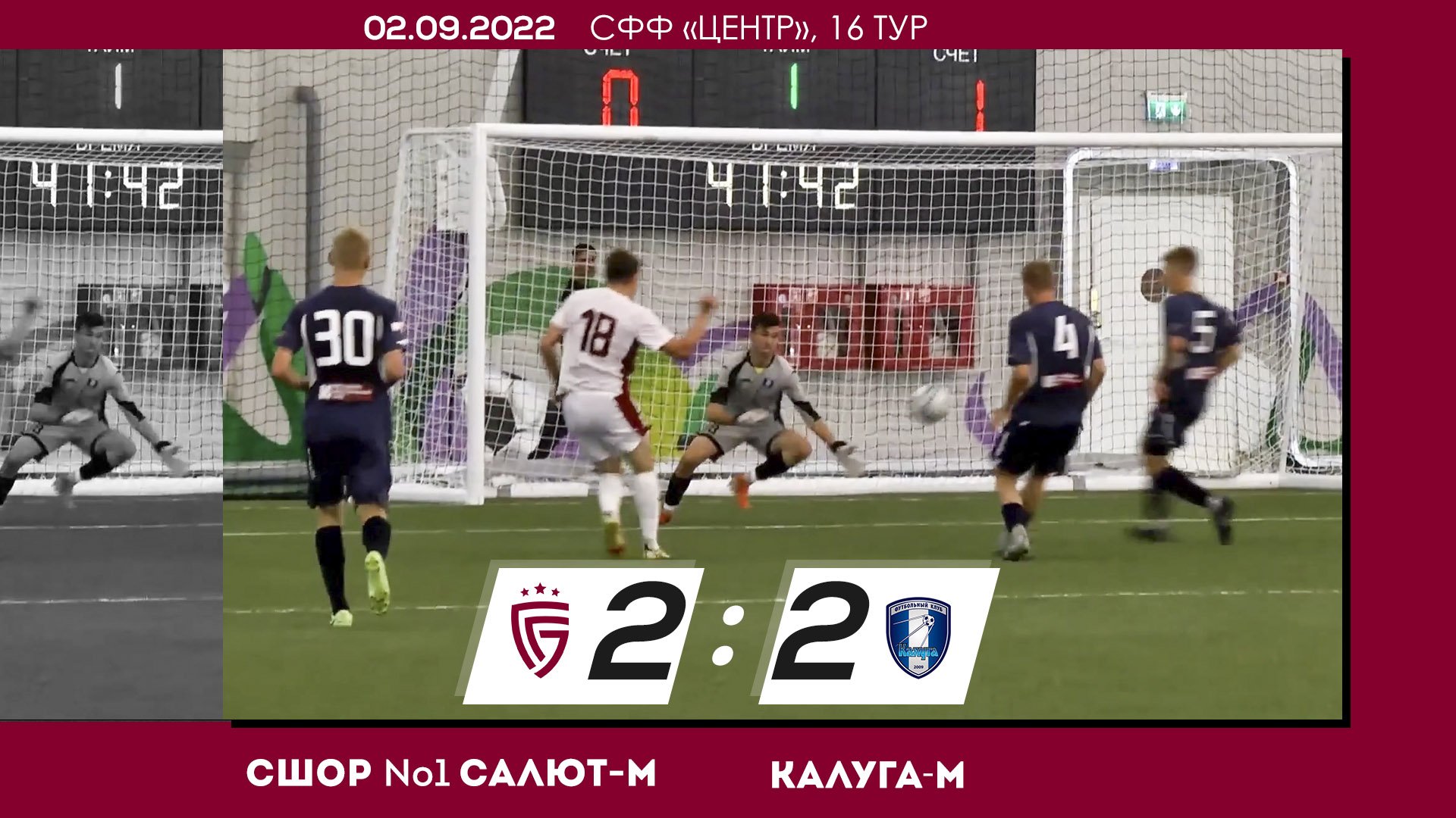 информация о матче: Дата: 02.09.2022 Cоперники: СШОР №1 Салют-М (Белгород) - Калуга-М (Калуга) Счет: 2:2 Голы: Павел Башмаков (16' Калуга-М (Калуга)) Алексей Курзенев (42' СШОР №1 Салют-М (Белгород)) Юрий Пустовитенко (63' СШОР №1 Салют-М (Белгород)) Андрей Косенко (79' Калуга-М (Калуга))
