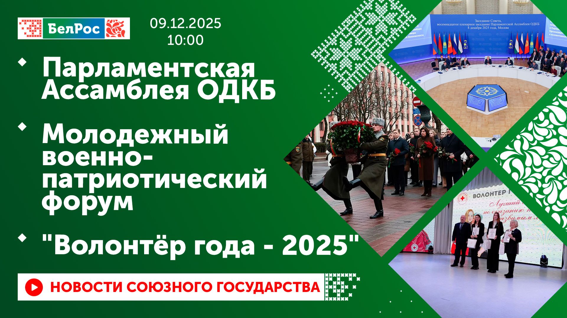 Закадровый текст озвучивает *ИИ Антон* Новости 09.12.2025 на 10:00 - В Москве прошло совместное заседание Совета и Парламентской ассамблеи ОДКБ. - Главы делегаций возложили цветы к Могиле Неизвестного Совета. - Первый молодёжный военно-патриотический форум стартовал в Минске. - В Гродно подвели итоги проекта "Волонтёр года - 2025". - Торжественное открытие зимнего сезона прошло на крупнейшем катке мира. Смотрите главные новости Союзного государства на телеканале БелРос. Ссылки на наши соц. сети Сайт: http://belros.tv/ Telegram: https://t.me/belrostv Одноклассники: https://ok.ru/group/55657426976918 ВКонтакте: https://vk.com/belrostv TikTok: https://www.tiktok.com/@belros_tv?_t=... RuTube: https://rutube.ru/channel/23501830/ Яндекс. Дзен: https://zen.yandex.ru/belrostvv Наши подкасты на Яндекс. Музыке: https://music.yandex.ru/album/25615251 #главныеновости #новостисегодня #СоюзноеГосударство