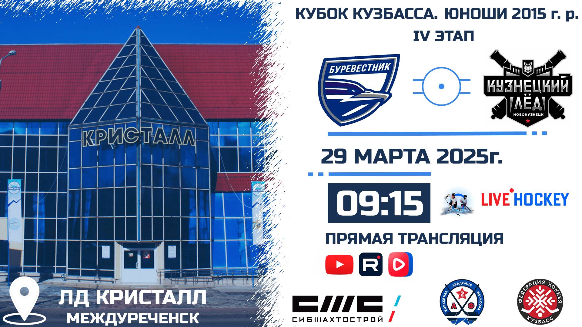 ПРЯМАЯ ТРАНСЛЯЦИЯ МАТЧА 29.03.2025г. в 9:15 БУРЕВЕСТНИК (Томск) VS КУЗНЕЦКИЙ ЛЕД (Новокузнецк) КУБОК КУЗБАССА СРЕДИ ЮНОШЕЙ 2015 г.р. ССЫЛКИ НА МАТЧИ: https://bit.ly/TYTCLICK СТАДИОН: ЛД КРИСТАЛЛ КОММЕНТАТОРЫ: ТРАНСЛЯЦИЯ НА YOUTUBE: https://youtube.com/live/OERlsM8d5Bc?feature=share ТРАНСЛЯЦИЯ В СООБЩЕСТВЕ VK: https://vkvideo.ru/video-229078074_456239226