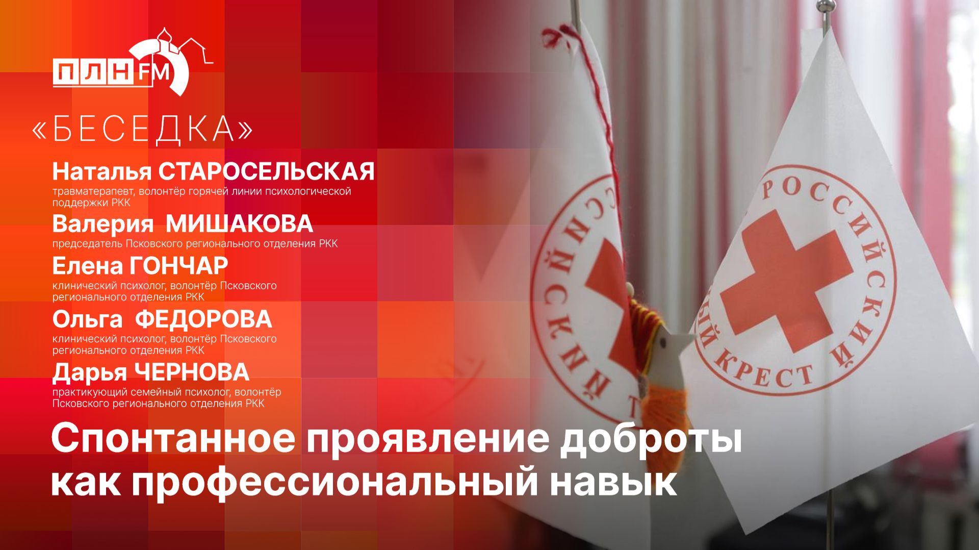 Гости: Наталья Старосельская - травматерапевт, волонтёр горячей линии психологической поддержки Российского Красного Креста. Валерия Мишакова - председатель Псковского регионального отделения Российского Красного Креста. Елена Гончар - клинический психолог, волонтёр Псковского регионального отделения Российского Красного Креста. Ольга Федорова - клинический психолог, волонтёр Псковского регионального отделения Российского Красного Креста. Дарья Чернова – практикующий семейный психолог, волонтёр Псковского регионального отделения Российского Красного Креста. Видео ПЛН-ТВ
