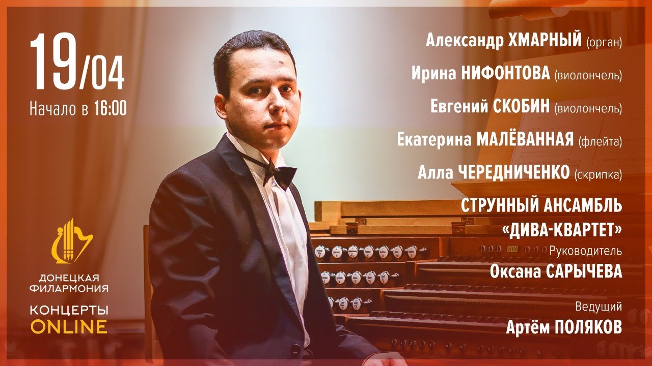 02:06 В. Любек. Прелюдия и фуга ре-минор Александр Хмарный 10:50 И. С. Бах. Ариозо из кантаты BWV 156 Александр Хмарный и Ирина Нифонтова 14:58 М. Маре. Фолия Александр Хмарный и Евгений Скобин 25:23 Т. Альбинони / Р. Джадзотто. Адажио соль-минор Александр Хмарный и Ирина Нифонтова 33:12 В. А. Моцарт. Анданте до-мажор К. 315 Александр Хмарный и Екатерина Малёванная 39:50 Дж. Фрескобальди/ Г. Кассадо. Токката Александр Хмарный и Ирина Нифонтова 45:43 И. С. Бах. Ария Петра («Erbarme dich») из «Страстей по Матфею» BWV 244 Александр Хмарный, Евгений Скобин и Ирина Нифонтова 55:25 М. Корретт. Концерт для органа, флейты и струнных ре-минор ор. 26 №6 Александр Хмарный, «Дива-квартет», инструменталисты Донецкая государственная академическая филармония http://filarmonia-donetsk.ru https://vk.com/philarmonia https://t.me/donfilarmonia https://ok.ru/donfilarmonia