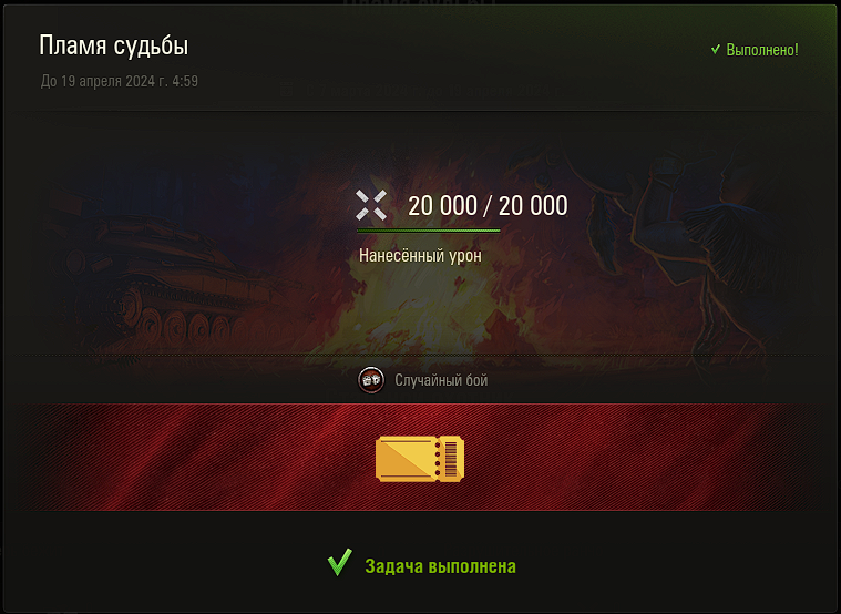 бонус-кодик 7FLAMEOFDESTINY При активации получаете боевую задачу: - За любое количество боёв нанести 20 000 ед. урона технике противника. - Выполняется на технике VI уровня и выше, один раз на аккаунт в режиме «Случайный бой». Бои в Генеральном сражении не учитываются. В награду за выполнение получаете билет участника розыгрыша призов на трансляции "Легендарной семёрки". Можно выиграть золото или один из трёх игровых ПК. 🎲 Розыгрыш 20-21 апреля. Всем удачи! Активировать здесь: https://lesta.ru/shop/redeem/