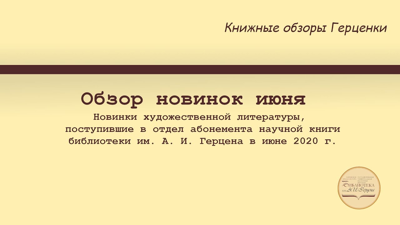 Представляем видеообзор художественной литературы, поступившей в отдел абонемента научной книги во 2 квартале 2020 г. Среди новинок как известные, так и неизвестные авторы, получившие признание среди читателей и литературных критиков: 1. Савельев, И. В. Как тебе такое, Iron Mask? : роман : [18+]. - Москва, 2019 (макет 2020). - 349, [1] с. - (Актуальный роман) 2. Беляк, С. В. Адвокат дьяволов : хроника смутного времени от известного российского адвоката : 18+. - Санкт-Петербург [и др.], 2020. - 576 с. 3. Кибиров, Т. Ю. Генерал и его семья : исторический роман : [18+]. - Москва, 2020. - 621, [1] с. 4. Синицкая, С. Мироныч, дырник и жеможаха [Текст] : рассказы о Родине : [16+]. - Санкт-Петербург, 2019. - 366, [2] с. 5. Готлиб, М. Возвращение : роман : 18+. - Санкт-Петербург, 2020. - 334, [1] с. 6. Урреа, Л. А. Дом падших ангелов = The House of Broken Angels : роман : [18+]. - Москва, 2020. - 412, [3] с. 7. Оуэнс, Д. Там, где раки поют = Where the Crawdads Sing : роман : [16+]. - Москва, 2019. - 413, [2] c. 8. Менон, С. Когда Димпл встретила Риши : [роман : 16+]. - Москва, 2018. - 445, [1] с. - (Бестселлер New York Times) 9. Харкуэй, Н. Гномон = Gnomon : [18+]. - Москва, 2019 (макет 2020). - 861, [1] с. -(Великие романы) 10. Краснахоркаи, Л. Меланхолия сопротивления = Az Ellenállás Melankóliája : роман : [18+]. - Москва, 2020. - 444, [1] с. - (Corpus. 560) 11. Итурбе, А. Хранительница книг из Аушвица : роман : [основано на реальной истории узницы Аушвица Диты Краус : 18+]. - Москва, 2020. - 638, [1] с. - (Серия Rebel) «Книга как лекарство»: читайте на здоровье! http://herzenlib.ru/main/source/detail.php?CODE=2020_04_otd_abon_1 Из новых поступлений http://herzenlib.ru/main/source/new-arrivals/ Отдел абонемента научной книги рекомендует: Писатели новой России http://herzenlib.ru/main/source/detail.php?CODE=2020_06_otd_abon_1 ВКонтакте: https://vk.com/aboherzen
