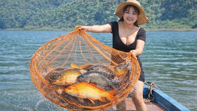 Деревенская девушка ловит рыбу сетью на озере. Неожиданный улов крупного карпа и телапии. Вьетнам