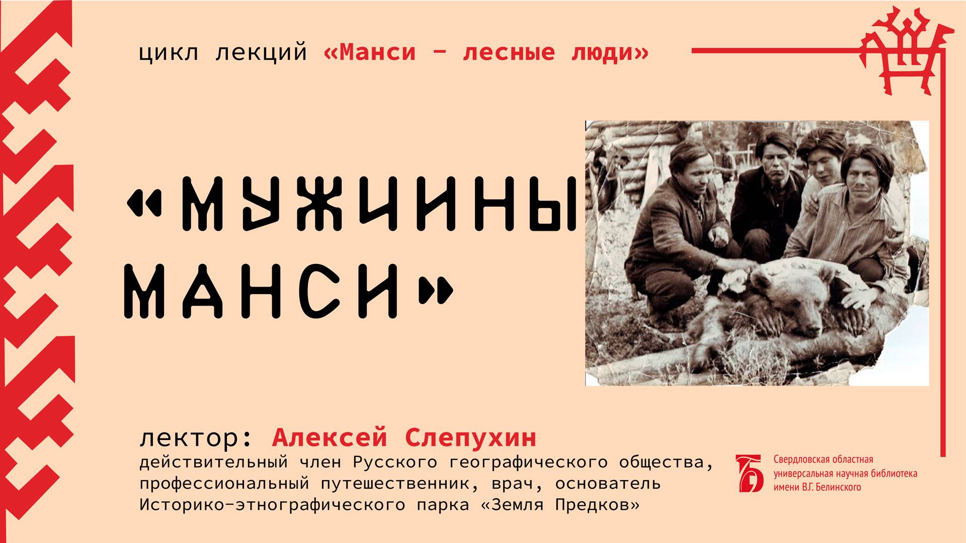Лекция из цикла «Манси – лесные люди». Мир таежных людей начал формироваться очень давно. Законы существования общества претерпевали различные изменения в зависимости от разнообразных факторов: соседи, завоеватели, климатические условия, система питания и мировоззрение. Но главенствующая роль мужчин у древних охотников в наших горах прослеживается на протяжении длительного периода, уходя глубоко в тайны веков. Наследниками культур древних людей стали представители последнего (к приходу русскоязычного населения) коренного народа на Среднем и Северном Урале – вогулы или манси. Лектор – Алексей Слепухин, действительный член Русского географического общества, профессиональный путешественник, основатель Историко-этнографического парка «Земля Предков». Лекция состоялась в 2022 г. Свердловская областная универсальная научная библиотека им. Белинского http://book.uraic.ru/ сайт https://vk.com/club6745014 VK