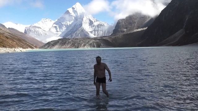 Непал .Гималаи.Nepal.Октябрь 2018.Озеро Чола (4800) и Чолатзе(6400) около дер.Зонгла(перед Чола пасс).Красивое место.Над озером и в нем прекрасная Ама Даблам.Водопадик,облака,пахнет багульником.Задержались на денек перед Чола Пассом.
