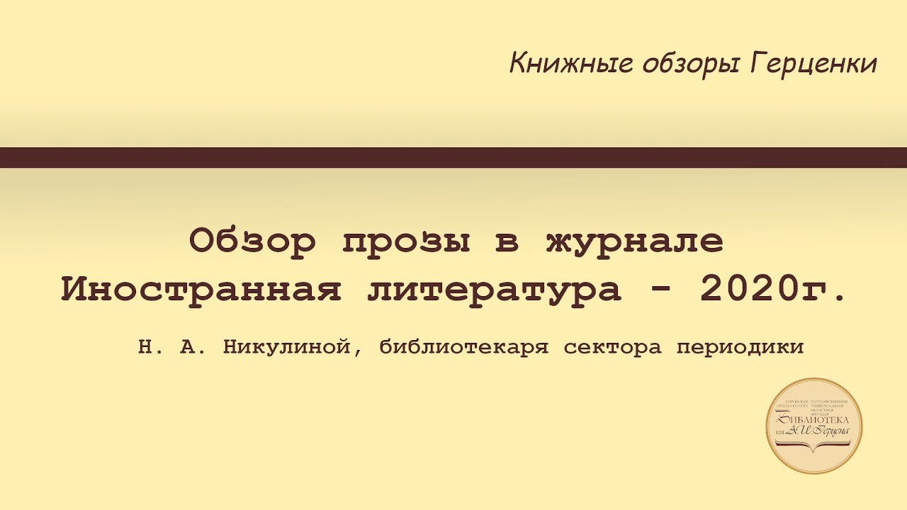 Предлагаем к просмотру обзор прозы в журнале Иностранная литература за 2020 год, который подготовила Н. А. Никулина, библиотекарь сектора текущей периодики. Сайт библиотеки им. А. И. Герцена – http://herzenlib.ru/