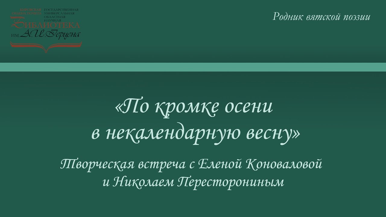 «По кромке осени в некалендарную весну» – так называется онлайн-встреча с кировскими поэтами Николаем Пересторониным и Еленой Коноваловой. Сложившееся из заглавий книг наших добрых друзей и авторов, название это не исчерпывает творческих возможностей поэтического дуэта. Дополняя друг друга, они не теряют своей индивидуальности. Автор двух сборников стихов «Моё село на косогоре» и «По кромке осени», книги стихов и прозы «Белое на плечи – доброму навстречу» Елена Коновалова опубликовала недавно свою маленькую повесть о большой любви «Есть на свете цветок». Николай Пересторонин пополнил свой творческий багаж, состоящий из двадцати пяти книг, ещё одной, озаглавленной «Для тебя». Прибавьте к этому работу над альманахом «Вятка литературная», ежемесячным литературным журналом «Ротонда», который с недавних пор начал выходить в Кирове и вы поймете, что тем для онлайн-общения с читателями будет немало. Ну, а стихи – лирические, духовно наполненные нужны нам всегда. Сайт библиотеки им. А. И. Герцена – http://herzenlib.ru/ (материал от 24 июл. 2020 г.)