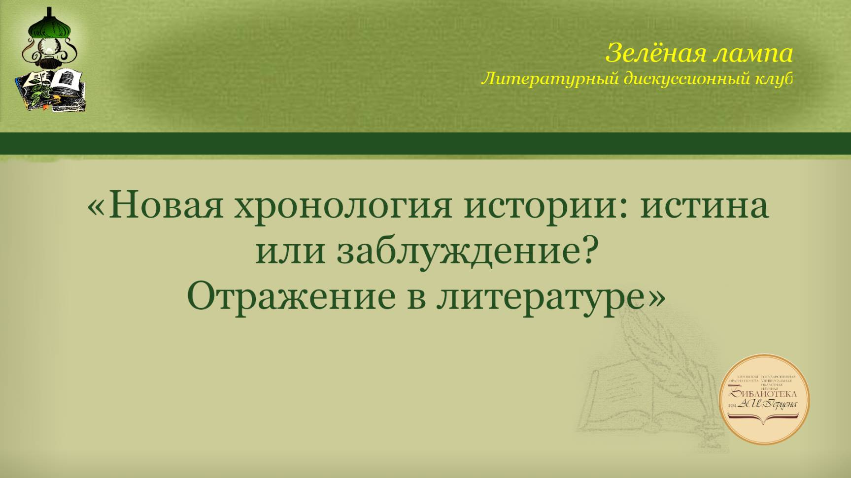 Очередное заседание литературного дискуссионного клуба «Зелёная лампа» было посвящено концепции радикального пересмотра всемирной истории, известной сегодня как «Новая хронология». Ведущие Татьяна Машковцева и Андрей Марков попытались разобраться, что же это за явление – новое направление в исторической науке или просто околонаучная литература, всего лишь забавное чтение на досуге. Идея о том, что общепринятая версия хронологии античности и средних веков, составленная монахами Иосифом Скалигером и Дионисием Петавиусом, существенно искажена и нуждается в ревизии, высказывается в историографии не впервые. В XVI веке против скалигеровской хронологии выступил профессор Саламанкского университета de Arcilla. Учёный-иезуит Жан Гардуэн(1646—1729), крупный филолог своего времени, пришёл к выводу, что ряд позднеантичных произведений на самом деле написан в Средние века. Попытку ревизии хронологии предпринял Исаак Ньютон, который потратил несколько десятков лет на математический анализ древней истории. В кратком виде его идеи были изложены в книге «The Chronology of Ancient Kingdoms Amended» («Исправленная хронология древних царств»). Немецкий приват-доцент Роберт Бальдауф (публикация 1902–1903 годов), английский историк Эдвин Джонсон (1842–1901) и другие. В конце концов, сам термин «Возрождение» ввёл Жюль Мишле только в 1838 году — ведь художники, ученые и писатели XIV–XVI веков, как полагают, возрождали именно античность. В конце ХХ — начале ХХI века были опубликованы работы германских учёных Герберта Иллига, Гуннара Хейнсона, Уве Топпера, критически анализирующих хронологию Скалигера. В России первым исследователем, по-настоящему широко и радикально поставившим вопрос о научном обосновании хронологии, предшественником современных разработчиков «Новой хронологии» был русский революционер, ученый-энциклопедист почётный член Академии наук СССР Николай Александрович Морозов. Учёный провёл ревизию датировок древних астрономических событий, описанных в летописях, и пришёл к выводу, что значительная часть исторических датировок просто необоснована. Многие древние астрономические события Морозов передатировал, получив в результате значительно более поздние даты. На Западе идеи Морозова для построения собственного варианта хронологии, в основу которого была положена теория «катастрофизма» использовал психоаналитик Иммануил Великовский.