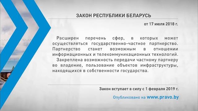 Расширен перечень сфер, в которых может осуществляться государственно-частное партнерство. Партнерство станет возможным в отношении информационных и телекоммуникационных технологий. Закреплена возможность передачи частному партнеру во владение, пользование объектов инфраструктуры, находящихся в собственности государства. Закон вступает в силу с 1 февраля 2019 г.
