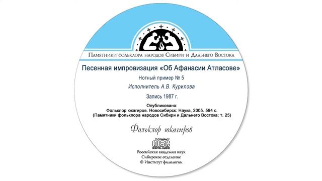 Песенная импровизация «Об Афанасии Атласове». Нотный пример № 5. Исполнитель А.В. Курилова, пос. Андрюшкино Нижнеколымского района Якутии. Запись 1987 г. Опубликовано: Фольклор юкагиров. Новосибирск: Наука, 2005. 594 с. (Памятники фольклора народов Сибири и Дальнего Востока; т. 25).