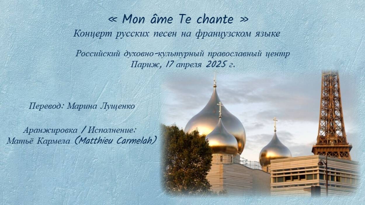 Репетиция концерта русских песен на французском языке « Mon âme Te chante » («Поет мое сердце») в Российском духовно-культурном православном центре в Париже, 17 апреля 2025 г. Перевод: Марина Лущенко. Аранжировка/Исполнение: Матьё Кармела (Matthieu Carmelah). Записи самого концерта нет, к сожалению. Композиции: - L’étoile d’amour - Гори, гори, моя звезда - Un ange volait – Ангел (М. Лермонтов) - La ville d’or – Город золотой - Une route sans fin – Дорога без конца - Un pays d’énigmes – Купола российские (В. Высоцкий)