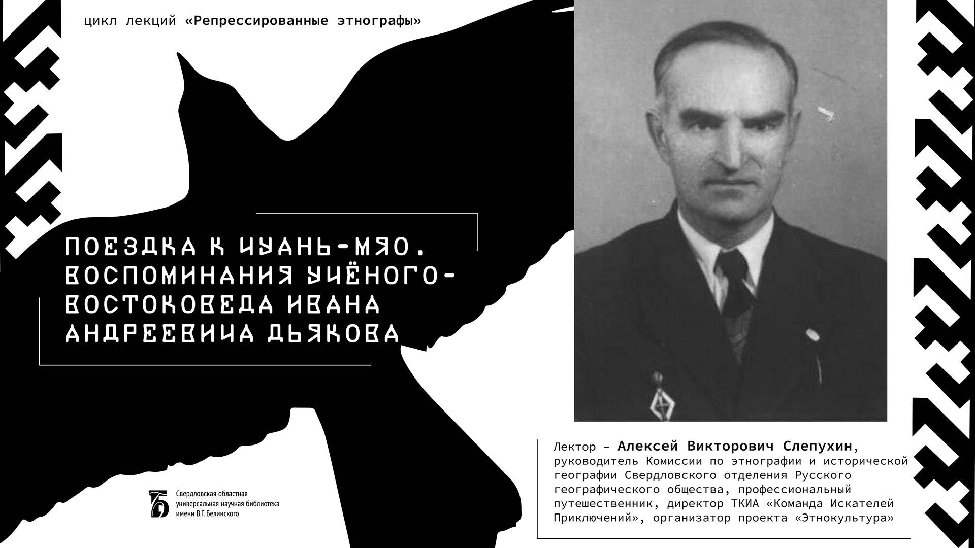 Лекция Алексея Слепухина из цикла «Репрессированные этнографы. Переломанные судьбы». Предстоящий разговор будет посвящен ученому-востоковеду Ивану Андреевичу Дьякову (14(26)09.1881–22.08.1963). Имя Ивана Андреевича Дьякова известно довольно ограниченной группе людей. Даже среди профессиональных этнографов о нем почти не вспоминают. Забыли. Среди востоковедов оказалось много совершенно разных специалистов: переводчики, деятели национальной культуры, лингвисты, сами этнографы –многогранные личности, что сумели реализоваться не только в этнографии, но и в других областях науки и культуры. Таким был и Дьяков. Свердловская областная универсальная научная библиотека им. Белинского http://book.uraic.ru/ сайт https://vk.com/club6745014 VK