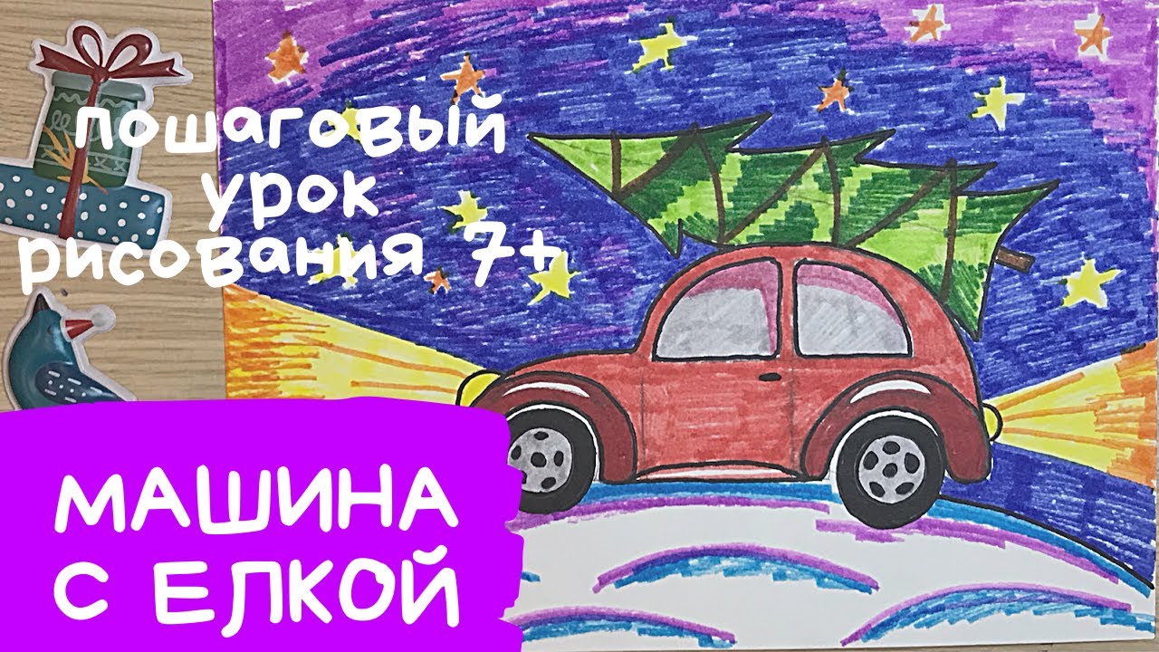 Машина с елкой рисунок. Машина рисунок легкий. Новогодние рисунки для детей. Новогодний рисунок