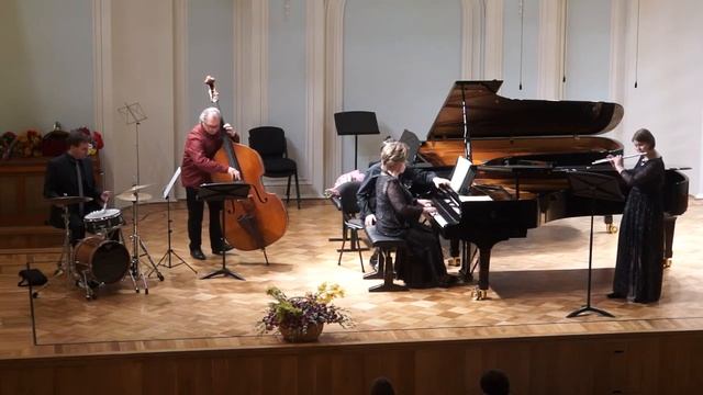 Концерт к юбилею Заслуженной артистки России, заведующей Межфакультетской кафедрой фортепиано, профессора Евгении Сергеевны Карпинской. К. Боллинг. Сюита для флейты и фортепиано (версия для джаз-трио и флейты). Часть V, «Ирландия», часть I, «Барокко и блюз». Анна Брюсова (флейта), Евгения Карпинская (фортепиано), Игорь Иванушкин (контрабас), Пётр Афанасьев (ударные).