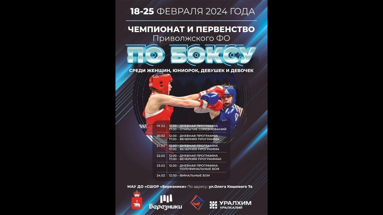 Чемпионат Приволжского федерального округа по боксу среди женщин 19-40 лет. ,(1984-2005 гг.р.), Первенство Приволжского федерального округа по боксу среди юниорок 19-22года (2002-2005 гг.p.) среди юниорок 17-18 лет (2006-2007 гг.p.), среди девушек 15-16 лет (2008-2009гг.р.), среди девушек 13-14 лет ( 2010-2011гг.р) Подписаться на канал: https://www.youtube.com/c/RussianBoxingFederation/?sub_confirmation=1 Федерация бокса России: http://rusboxing.ru/ ВКонтакте: http://vk.com/rusboxing Телеграм: http://t.me/RussianBoxers Одноклассники: http://ok.ru/group/64339915505917/ Дзен: https://zen.yandex.ru/rusboxing Состав пар 1-27 Танкова Виктория Удмуртия Прошко Арина Пермский 2-28 Маторина Арина Татарстан Халитова Яна Оренбургская Весовая категория 38 кг 3-29 Потапова Милена Оренбургская Хатмуллина Елизавета Пермский 4-30 Матвеева Анастасия Оренбургская Лысова Таисия Самарская Весовая категория 40 кг 5-31 Филиппова Анна Чувашия Собянина Александра Пермский 6-32 Хайрутдинова Диляра Татарстан Федоровская Ангелина Самарская Весовая категория 44 кг 7-33 Панаева Александра Татарстан Азаматова Алина Татарстан 8-34 Сабирова Карина Татарстан Ткачёва Юлия Самарская Весовая категория 46 кг 9-35 Морозова Вероника Самарская Шихова Александра Оренбургская 10-36 Колчина Ксения Башкортостан Отставнова Варвара Самарская Весовая категория 64 кг 11-37 Мажитова Шаура Башкортостан Крашенинникова Надежда Кировская 12-38 Янчикова Валерия Ульяновская Резвых Олеся Пермский Девушки 15-16 лет Весовая категория 46 кг 13-39 Зюряева Надежда Самарская Медведева Екатерина Самарская 14-40 Есина Ульяна Оренбургская Чикишева Марина Башкортостан 15-41 Мухамедова Камила Самарская Исхакова Карина Башкортостан 16-42 Мальцева Тамара Пермский Барышева Алиса Пермский ПЕРЕРЫВ 30 минут Весовая категория 50 кг 17-43 Гаврилова Кира Татарстан Галлямова Эльмира Башкортостан 18-44 Одинцова Кристина Нижегородская Акберова Айсель Саратовская 19-45 Григорьева Диляна Ульяновская Романова Алина Пензенская 20-46 Хижова Виктория Оренбургская Ившина Кристина Удмуртия Весовая категория 57 кг 21-47 Амирова Каролина Башкортостан Дворкина Диана Ульяновская 22-48 Чекалина Анастасия Нижегородская Сафиуллина Дина Татарстан 23-49 Кузьмина Анна Башкортостан Голикова Ксения Самарская 24-50 Панечкина Анастасия Ульяновская Казакова Виктория Кировская Юниорки 19-22 года Весовая категория 48 кг 25-51 Шатина Екатерина Нижегородская Максимова Динара Башкортостан Весовая категория 50 кг 26-52 Тупкова Азиза Пермский Афанасьева Валерия Саратовская Весовая категория 52 кг 27-53 Яковлева Алсу Оренбургская Доронина Ирина Пермский #бокс #boxing