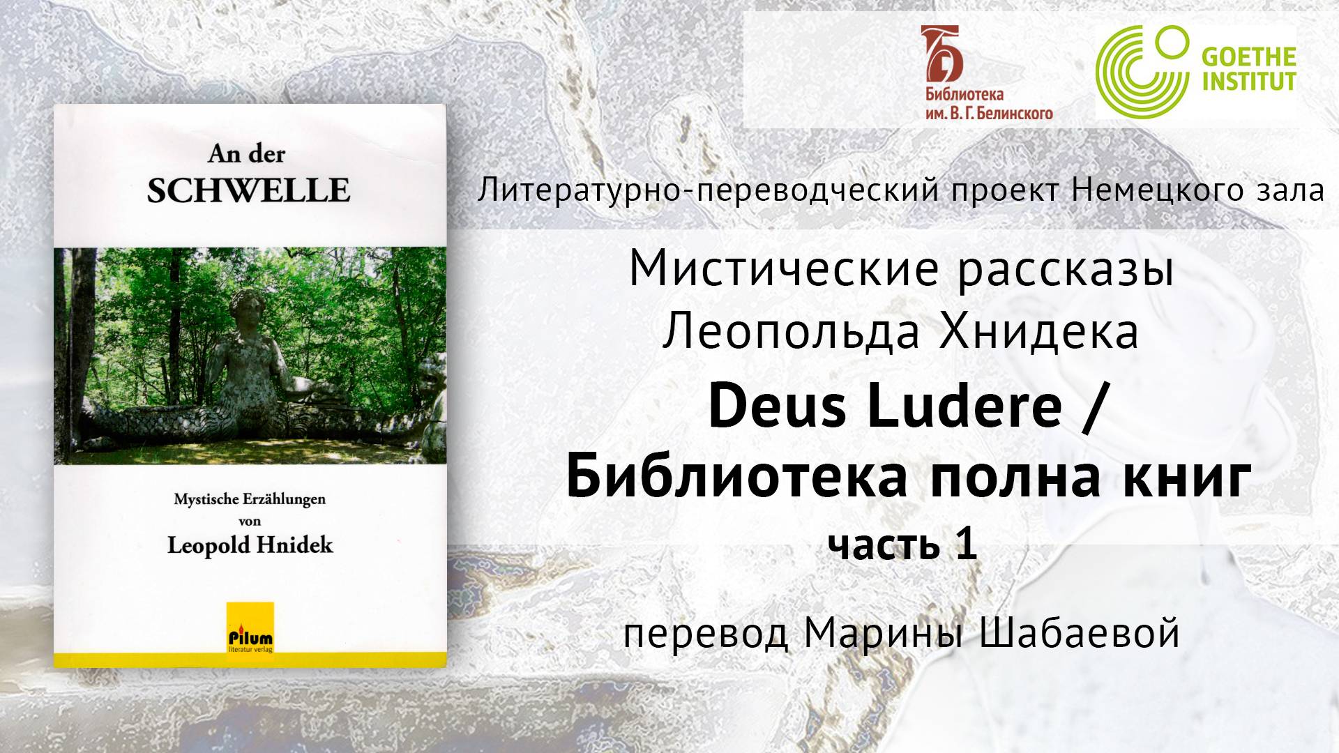 27 мая 2022 г. Впервые сборник мистических рассказов Леопольда Хнидека "An der Schwelle" вышел в свет в 1994 году. Второй тираж 2015 года составили 15 рассказов, каждый из которых, помимо немецкого, имеет также латинское или греческое название, что является частью концептуального замысла автора. Рассказ из сборника - «Deus Ludere / Библиотека полна книг» - представлен здесь в формате аудиокниги в рамках литературно-переводческого проекта Немецкого зала Белинки на русском языке. Читает: Марина Шабаева. Монтаж: Анастасия Тихонова. Свердловская областная универсальная научная библиотека им. Белинского http://book.uraic.ru/ сайт https://vk.com/club6745014 VK