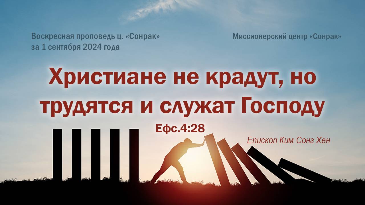 «Не кради!» — это заповедь встречается не только в Ветхом Завете, но и часто упоминается в Новом Завете. Каждый должен отвратиться от воровства, тем более христиане, созданные новым человеком по Божьему образу в истинной праведности и святости. Многие думают: «Эта заповедь ко мне не относится». Однако воровство — это не только кража вещей. Присвоение чужого нечестным путем для своей выгоды тоже является воровством, как и присвоение результатов чужого труда. На самом деле весь мир погряз в воровстве. Но есть намного худшее воровство, чем обычное, — это воровство у церкви. Человек совершает ошибки в своей жизни, но нельзя даже допустить мысль украсть что-то у церкви. Это все равно что снова распинать Божьего Сына, умершего на кресте, и снова надругаться над Ним. Церковь — это Тело Христово, которое Он создал, после того как понес наши грехи и умер вместо нас. И если снова проявлять ветхого человека и причинять вред Телу Христа, сможем ли мы снова получить возможность покаяния? В Ефесской церкви, помимо иудеев, воспитанных по Закону, было много верующих из язычников. В результате их привычка воровать, которую они обрели еще со времен мирской жизни, проявлялась и внутри церкви. Поэтому Павел говорил: «Кто крал, впредь не кради, а лучше трудись, делая своими руками полезное, чтобы было из чего уделять нуждающемуся» (Ефс.4:28). Он подчеркивает не только оставить воровство, но как бы трудно и утомительно это ни было, усердно трудиться своими руками, чтобы делать добро — то есть, материально поддерживать дела Божьего царства. Когда Бог вывел израильский народ из Египта, Он заповедал им, чтобы на Ханаанской земле они не ожесточали свое сердце перед бедностью ближних, но обязательно помогали друг другу. Божья воля была в том, чтобы исполнить завет, заключенный с Авраамом, то есть принять его потомков за свой народ и через них благословить все народы мира. Следуя этой заповеди, израильтяне на протяжении многих лет собирали для вспоможения святым. Также, не только во времена служения Иисуса на земле, но и после Его вознесения, святые первых церквей помогали успешному продвижению Евангелия. И сегодня это продолжается в форме приношений, в зависимости от обстоятельств церкви. Нам необходимо избавиться от воровства, наносящего вред церкви. Теперь каждый должен усердно трудиться, делая полезное для церкви. Когда вся община объединится сердцами, тело Христово будет успешно созидаться. Наши приношения Богу — это своего рода исповедание веры, гарантирующие наше вечное единство с Ним. Так или иначе мы должны трудиться. Так пусть наш труд будет посвящен не короткой земной жизни, а делам Господа и Его Царства! Давайте драгоценно использовать эту единственную возможность трудиться для Господа! Христиане не крадут, но трудятся и служат Господу (Ефс.4:28) Воскресная проповедь ц. «Сонрак» за 1 сентября 2024 года Епископ Ким Сонг Хен Миссионерский центр «Сонрак» вся проповедь здесь ↓↓↓↓↓↓↓↓↓↓↓↓↓ https://rutube.ru/video/bc8dd59c109d3c4ede7e17caa8892485/ Музыка Треков: 2 Classical inspiring Piano VCINE PB2 Dvir Zilverstone Dvir Zilverstone The Epic Cinematic StudioKolomna ЭЛ.ПОЧТА: berearussia2015@gmail.com САЙТ: http://www.berearussia.org/ ЮТУБ: https://www.youtube.com/channel/UCHrXAWxq5MlDJoY87fMjknw РУТУБ: https://rutube.ru/channel/25256916/about/ ТЕЛЕГРАМ: https://t.me/BLGOMISLIE ОДНОКЛАССНИКИ: https://ok.ru/profile/145281546893 ЯНДЕКС ДЗЕН: https://zen.yandex.ru/id/62327455dfb5ea6bd6b08d31 В КОНТАКТЕ: https://vk.com/id713958967