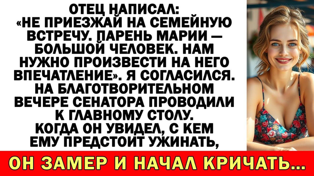 Отец написал: «Не приезжай на семейную встречу. Парень Марии — большой человек. Нам нужно произвести на него впечатление». Я согласился. На благотворительном вечере сенатора проводили к главному столу. Когда он увидел, с кем ему предстоит ужинать, он замер и начал кричать… Подборка историй из жизни с неожиданной концовкой: Истории из жизни| После развода муж ушёл. А его мама пришла… с багажом и без спроса. |Аудио рассказы - https://rutube.ru/video/4d565ef2db53df57c3a3570f94dd3361/ Свекровь учила меня семейной жизни… Муж поддакивал! Теперь живет у нее на раскладушке! - https://rutube.ru/video/a45ba8d386322b28a3b1acd16bc8c7a8/ Истории из жизни| Свекровь всполошилась |Аудио рассказы |Жизненные истории - https://rutube.ru/video/9b97e109cbd537dde3996440fc992e7c/ Муж решил вписать в мою квартиру свою маму после развода — но его ждала повестка! - https://rutube.ru/video/1a71e51ffddb89c1c7683bc2cdd1b621/ Истории из жизни| Родные решили, что все бесплатно, а я вложила 8500$ - https://rutube.ru/video/4b188c114d0fd7d51a6f1d515caf3a80/ Если любите сильные аудиорассказы и истории из жизни — этот рассказ вас не отпустит до финала. Здесь оживают настоящие семейные истории – драматичные, забавные, порой неожиданные, но всегда жизненные. Свекрови и невестки, тёщи и зятья, братья и сёстры – у каждого своя правда, свои эмоции и свои скандалы. Узнаваемые ситуации, острые конфликты и неожиданные развязки ждут тебя в каждом новом видео! Подпишитесь и напишите, как бы вы поступили на месте главных героев. Жизнь пишется без сценария, но каждая история оставляет след... #аудиорассказ #историяизжизни #жизненныеистории #семейнаядрама #предательство Аудиорассказ, аудиорассказы, история из жизни, истории из жизни, жизненная история, жизненные истории, семейная драма, про свекровь, про измену, про предательство, сильная история, рассказ до слёз, с неожиданной развязкой