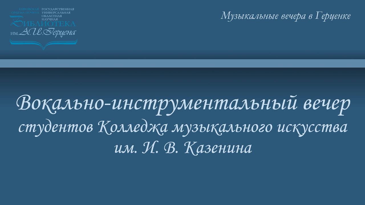 11 мая в рамках проекта «Музыкальные вечера в Герценке» в большом зале библиотеки состоялся Вокально-инструментальный вечер студентов Колледжа музыкального искусства имени И. В. Казенина. В вечере приняли участие Елизавета Двоеглазова (сопрано), Владислав Новосёлов (фортепиано), Марк Русаков (саксофон), Дарья Покидкина (сопрано), Василий Длинников (фортепиано), Вероника Соколова (сопрано), Ульяна Харюшина (фортепиано). Концертмейстерами выступили Юлия Юшина, Екатерина Сенникова и Анастасия Печёнкина, ведущей – Елена Геннадьевна Килякова, заведующая отделом обслуживания, куратор проекта «Музыкальные вечера в Герценке». (материал от 14 мая 2021 г.)
