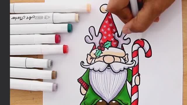 Как легко и шаг за шагом нарисовать и раскрасить гнома или домового. На рисунке изображены шапка Санты, оленьи рога, рождественский цветок на шапке и леденец в качестве трости. Для этого рисунка использовали только цветные маркеры на спиртовой основе. #рождество #какрисовать #гном #рождественскиерисунки #новыйгод #домовой