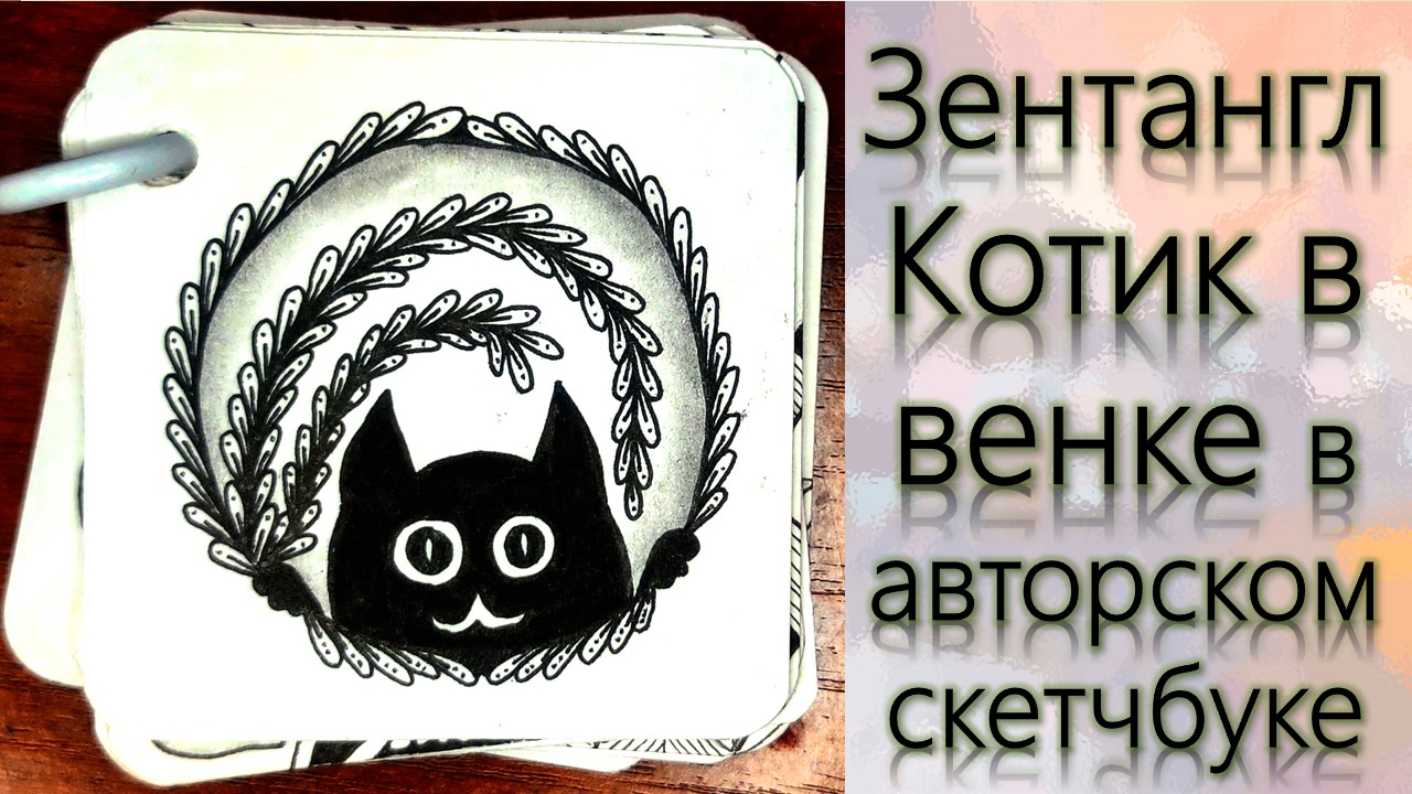 Зентангл Котик в венке в авторском скетчбуке