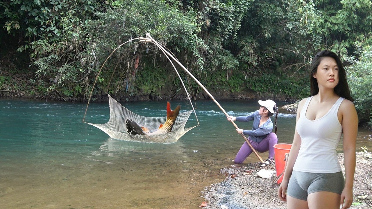 Девушка ловит рыбу в ручье. Традиционная рыбалка траловыми сетями. Ловит много крупной рыбы