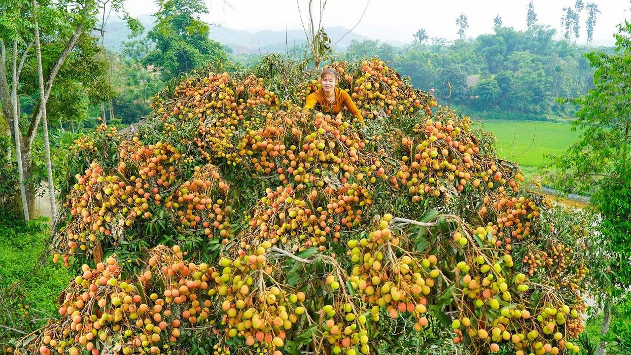 Ли Тье Тоан. Забралась на высокое дерево, чтобы собрать много плодов личи, для продажи на рынке. Вьетнам. Climb High To Harvest Lots Of Lychee Fruit, Use Horse-drawn Carts To Transport Lychees Go To Sell