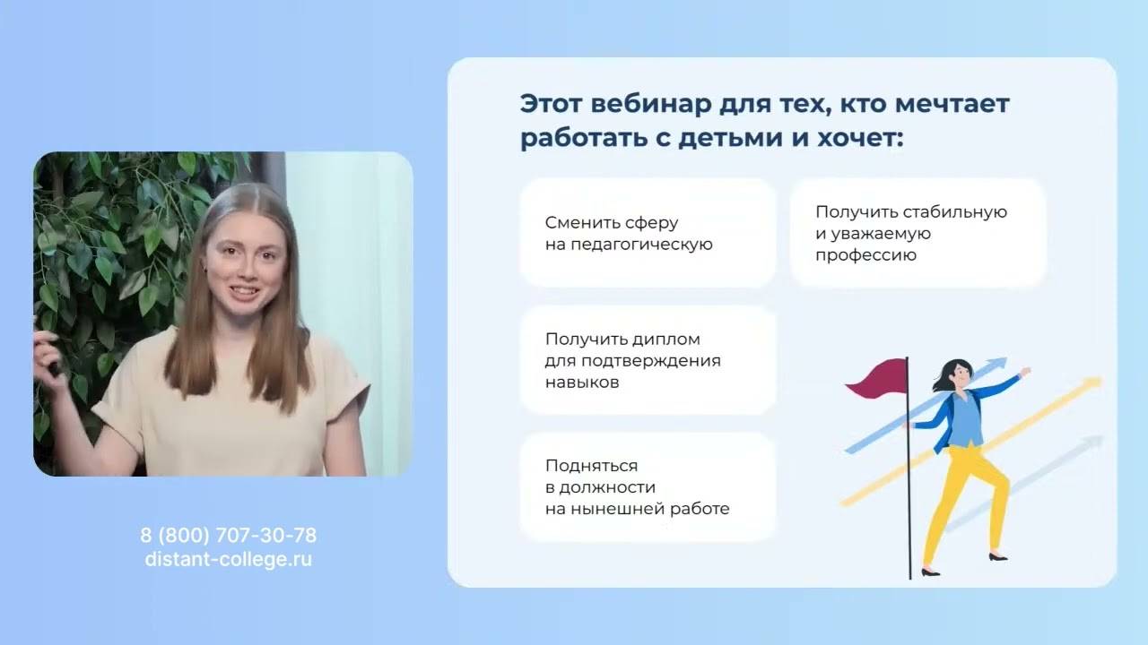 Колледж принимает без экзаменов и результатов ЕГЭ по специальностям: • Дошкольное образование • Преподавание в начальных классах • Педагогика дополнительного образования (в области социально-педагогической деятельности) • Педагогика дополнительного образования (в области ИЗО и ДПИ) • Педагогика дополнительного образования (в области технического творчества) • Педагогика дополнительного образования (в области сценической деятельности) • Специальное дошкольное образование • Коррекционная педагогика в начальном образовании Получите образование и два диплома за максимально короткий срок обучения! ✦ 2 года и 11 месяцев (после 11 класса) ✦ 3 года и 11 месяцев (после 9 класса) ► Заходите на сайт и выбирайте свою новую профессию! Подписывайтесь на нас в соц.сетях! ✔ Вконтакте - https://vk.com/distantcollege ✔ Telegram - https://t.me/nspk_college_group Сайт приемной комиссии distant-college.ru