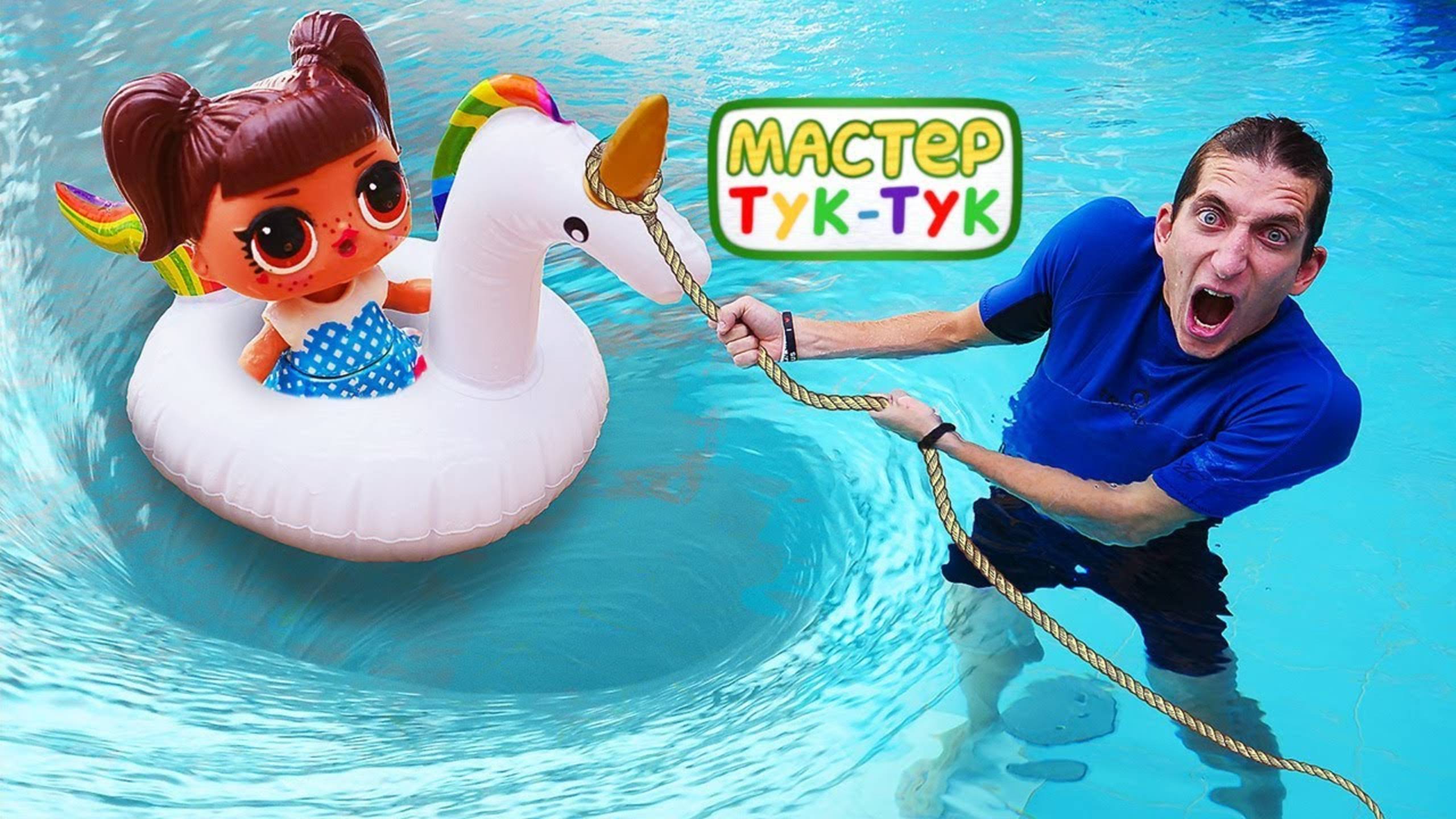 Видео с игрушками — Куклы ЛОЛ (LOL), надувной единорог, кораблик Элаяс и Мастер Тук-Тук в бассейне