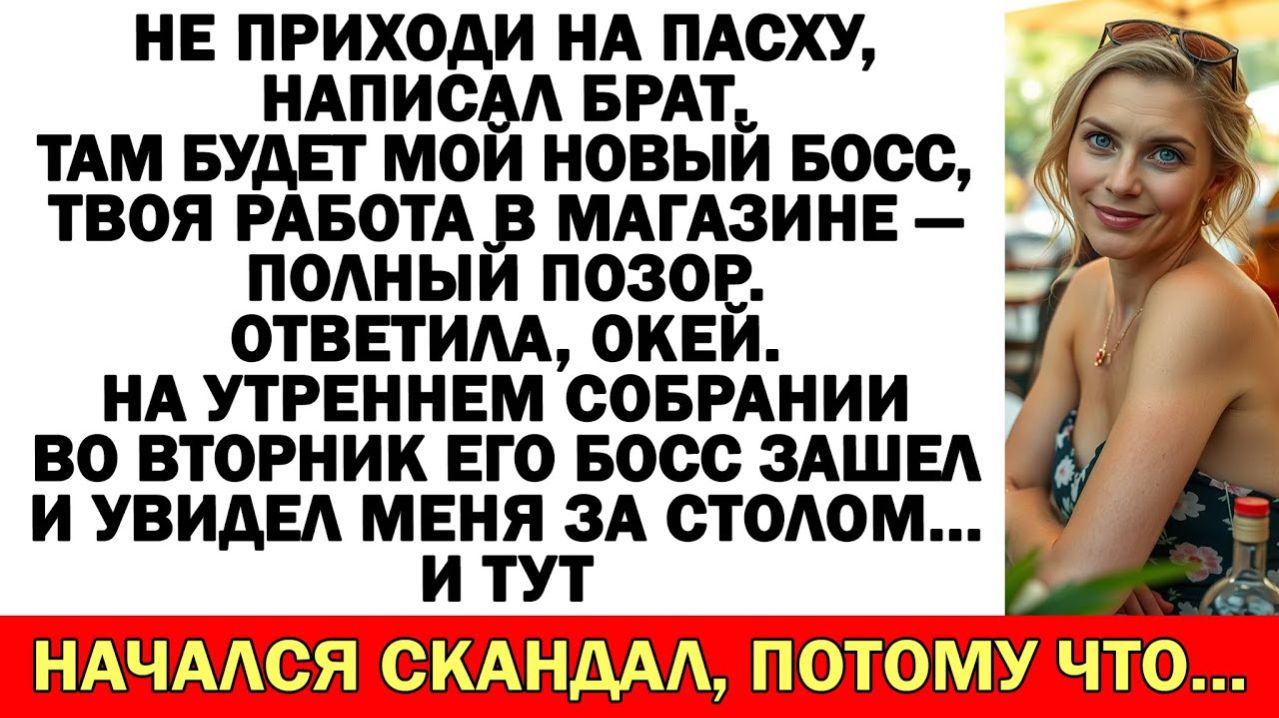 Не приходи на Пасху, написал брат. Там будет мой новый босс, твоя работа в магазине — полный позор. Ответила, окей. На утреннем собрании во вторник его босс зашел и увидел меня за столом... и тут начался скандал, потому что... Подборка историй из жизни с неожиданной концовкой: Истории из жизни| После развода муж ушёл. А его мама пришла… с багажом и без спроса. |Аудио рассказы - https://rutube.ru/video/4d565ef2db53df57c3a3570f94dd3361/ Свекровь учила меня семейной жизни… Муж поддакивал! Теперь живет у нее на раскладушке! - https://rutube.ru/video/a45ba8d386322b28a3b1acd16bc8c7a8/ Истории из жизни| Свекровь всполошилась |Аудио рассказы |Жизненные истории - https://rutube.ru/video/9b97e109cbd537dde3996440fc992e7c/ Муж решил вписать в мою квартиру свою маму после развода — но его ждала повестка! - https://rutube.ru/video/1a71e51ffddb89c1c7683bc2cdd1b621/ Истории из жизни| Родные решили, что все бесплатно, а я вложила 8500$ - https://rutube.ru/video/4b188c114d0fd7d51a6f1d515caf3a80/ Если любите сильные аудиорассказы и истории из жизни — этот рассказ вас не отпустит до финала. Здесь оживают настоящие семейные истории – драматичные, забавные, порой неожиданные, но всегда жизненные. Свекрови и невестки, тёщи и зятья, братья и сёстры – у каждого своя правда, свои эмоции и свои скандалы. Узнаваемые ситуации, острые конфликты и неожиданные развязки ждут тебя в каждом новом видео! Подпишитесь и напишите, как бы вы поступили на месте главных героев. Жизнь пишется без сценария, но каждая история оставляет след... #аудиорассказ #историяизжизни #жизненныеистории #семейнаядрама #предательство Аудиорассказ, аудиорассказы, история из жизни, истории из жизни, жизненная история, жизненные истории, семейная драма, про свекровь, про измену, про предательство, сильная история, рассказ до слёз, с неожиданной развязкой