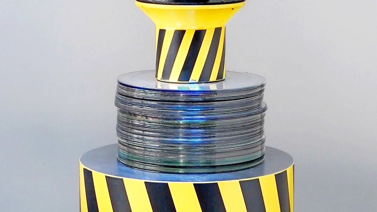 We test compact discs for strength with a hydraulic press