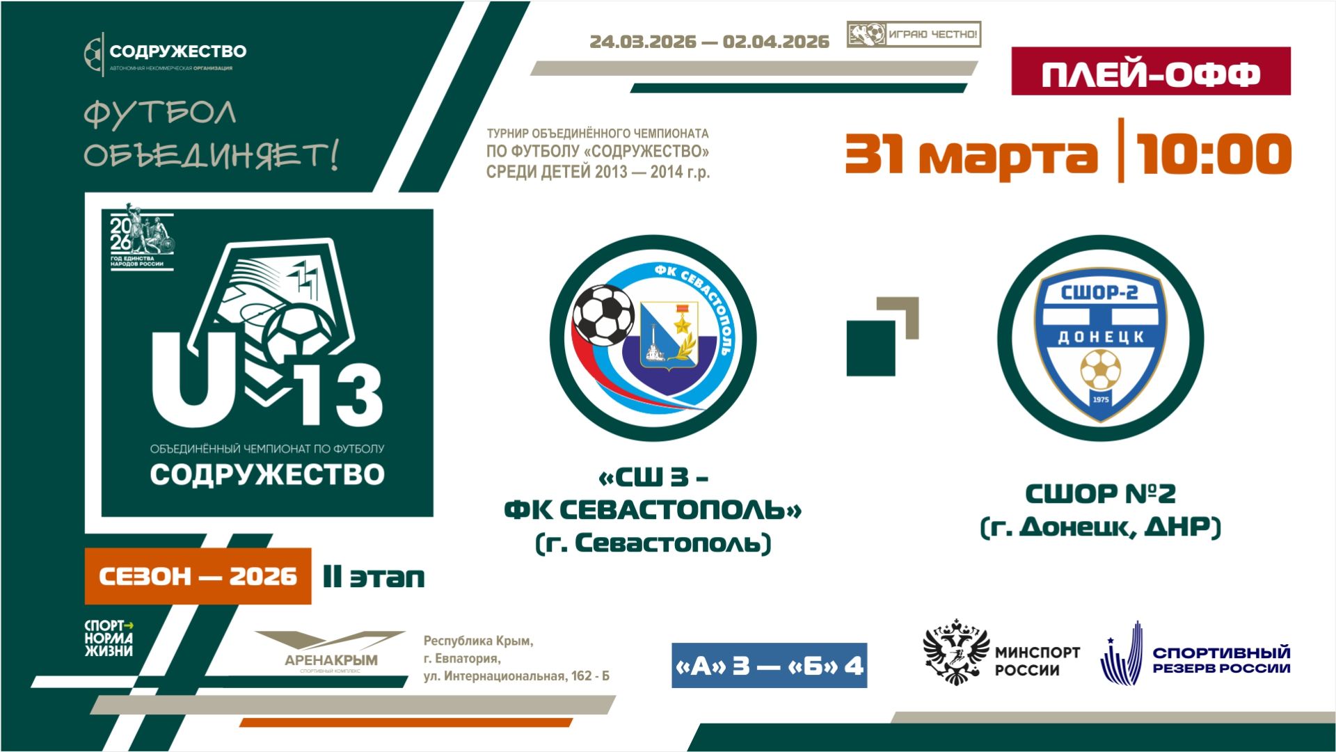Плей-офф за 5-8 места | СШ №3-ФК «Севастополь» (г. Севастополь) (А3) – (Б4) СШОР №2 (г. Донецк, ДНР) | 31.03.2026 | 10:00