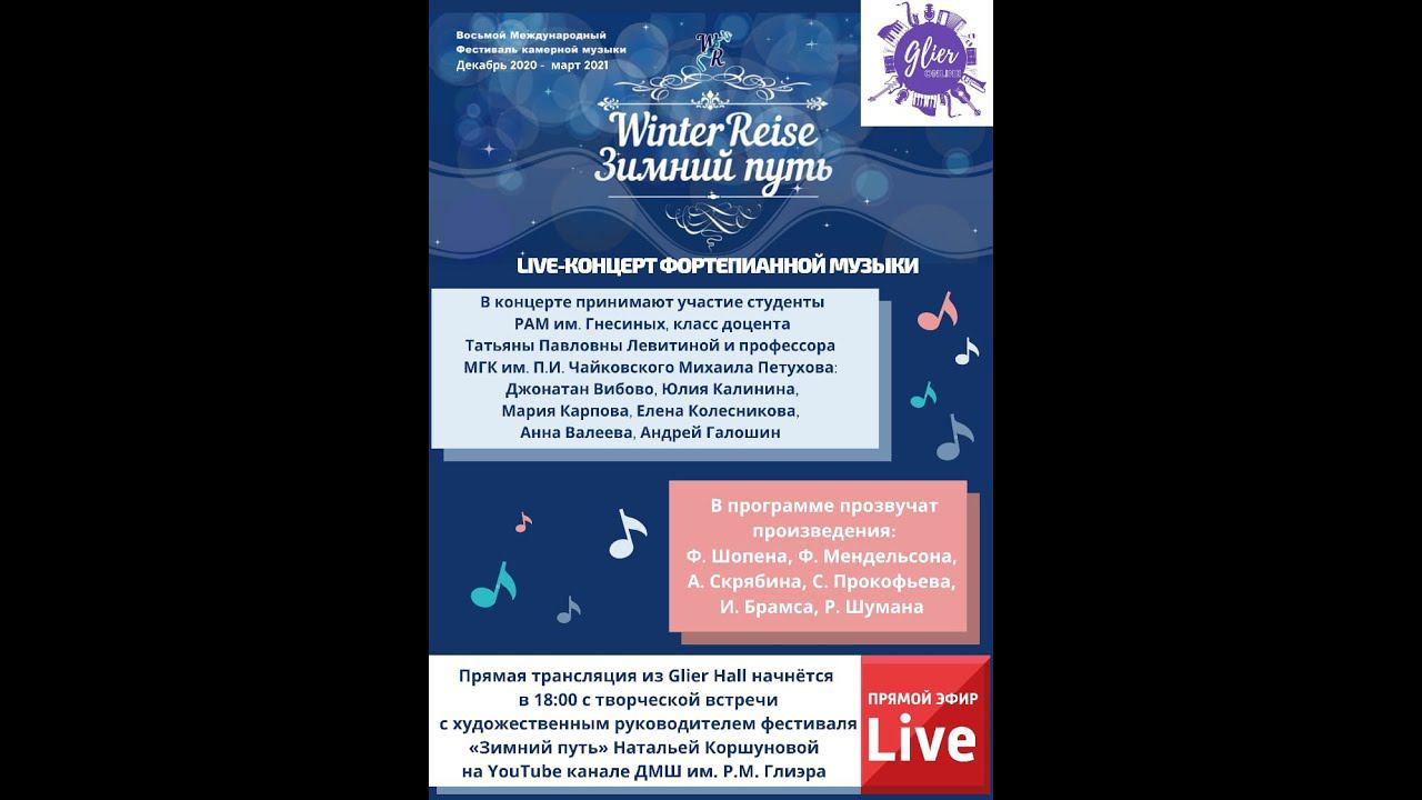Прямая трансляция из "Glier Hall" концерта серии проекта "Glier Online" В этом году в рамках фестиваля "Winter Reise" (Зимний путь) мы рады представить наше "фортепианное будущее" - студентов Российской академии музыки имени Гнесиных (класс декана фортепианного факультета, Заслуженной артистки России Татьяны Павловны Левитиной) и Московской государственной консерватории имени П. И. Чайковского (класс профессора, Заслуженного артиста России Михаила Петухова). Событие состоится в содружестве с ДМШ им. Р.М. Глиэра в форме онлайн-концерта в прямом эфире на YouTube канале «Детская музыкальная школа имени Р.М. Глиэра». Программа: 1. Ф. Шопен. Баркарола Фа-диез мажор (соч. 60) Исп. Джонатан Вибово (4 курс РАМ им. Гнесиных) 2. Ф. Мендельсон. Фантазия фа-диез минор (соч. 28) исп. Юлия Калинина (3 курс РАМ им. Гнесиных) 3. С. Рахманинов. Прелюдии Ре мажор и Ми-бемоль мажор Исп. Мария Карпова (2 курс РАМ им. Гнесиных) 4. С. Прокофьев. Соната № 3 ля минор. исп. Елена Колесникова 2 курс РАМ им. Гнесиных) 5. И. Брамс. Интермеццо и Рапсодия (соч. 119) исп. Анна Валеева (3 курс РАМ им. Гнесиных) 6. Р. Шуман. Симфонические этюды (соч. 13) Исп. Андрей Галошин (3 курс МГК им. П.И. Чайковского) Благодарим за помощь в подготовке трансляции и предоставленное оборудование "Steinberg" компанию "Yamaha Music" .