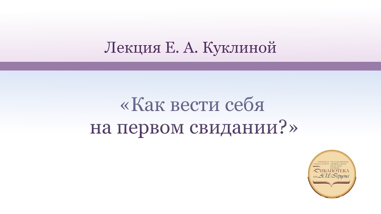 Ведущая - педагог-психолог, клинический психолог Екатерина Анатольевна Куклина. Первая встреча с человеком, который вас заинтересовал, связана с большими ожиданиями. Но часто, подстраиваясь под другого, мы не понимаем, как просто провести время с удовольствием и узнать друг друга без нервного напряжения. Как обдумать первое свидание? Как не стоит вести себя на свидании с незнакомым или малознакомым человеком, и какие темы в разговоре лучше вообще не затрагивать? Что сделать, чтобы обратить на себя внимание, да так, чтобы вы оставили непреодолимое желание встретиться вновь. Сайт библиотеки им. А. И. Герцена – http://herzenlib.ru/