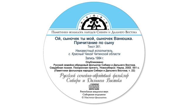 Ой, сыночек ты мой, сыночек Ванюшка. Причитание по сыну, текст 361. Неизвестный исполнитель, с. Красный Чикой Читинской области. Запись 1984. Опубликовано: Русский семейно-обрядовый фольклор Сибири и Дальнего Востока. Свадебная поэзия. Похоронная причеть. Новосибирск: Наука, 2002. 551 с. (Памятники фольклора народов Сибири и Дальнего Востока; т. 22).