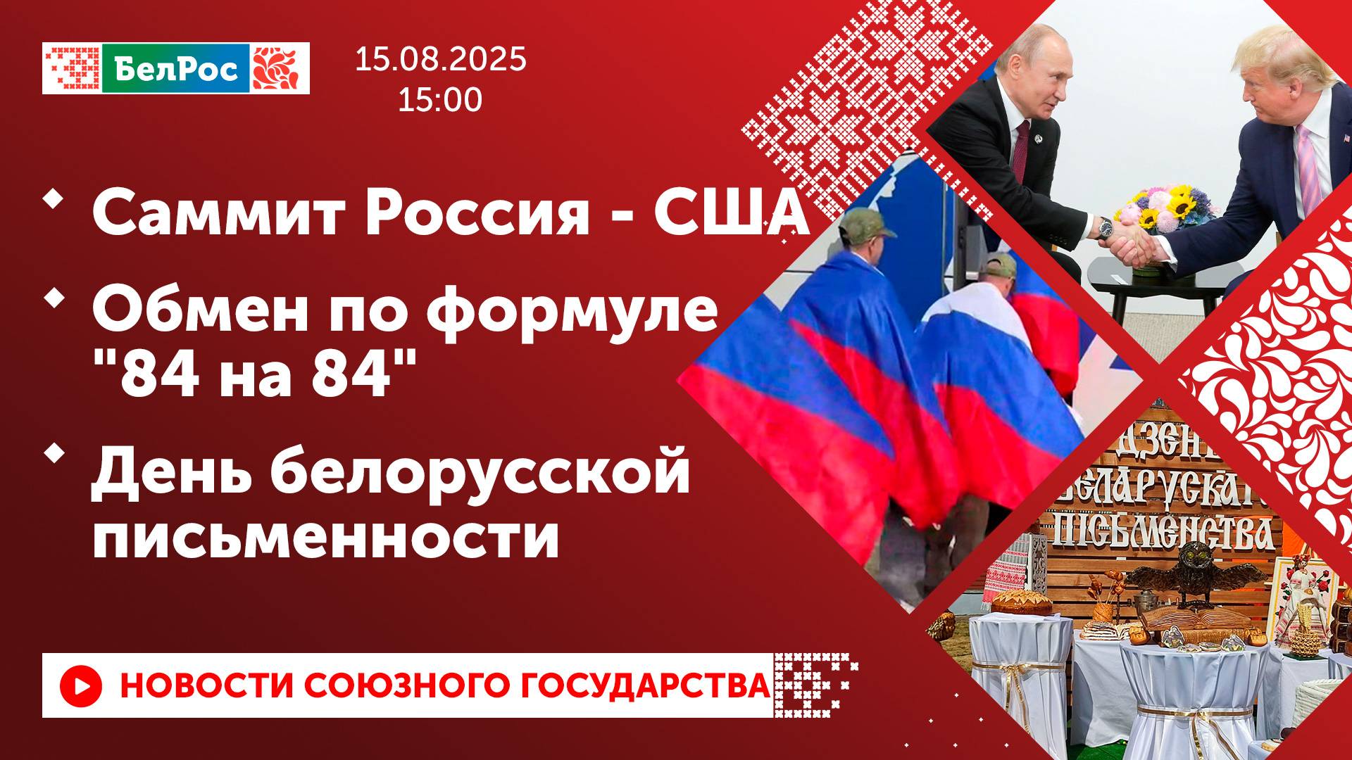 Закадровый текст озвучивает *ИИ Антон* Новости 15.08.2025 на 15:00 - NBC: Дональд Трамп лично встретит Владимира Путина в аэропорту на Аляске. - Начало встречи Владимира Путина и Дональда Трампа запланировано в 22:00 мск. - Сотни журналистов будут освещать встречу Владимира Путина и Дональда Трампа. - Владимир Путин - первый в истории российский лидер, который посетит Аляску. - 84 российских военнослужащих вернулись на Родину из украинского плена. - В результате атаки беспилотника на жилой дом 1 человек погиб, более 10 пострадали. - В Беларуси с 1 сентября 2025 года повышаются все виды трудовых пенсий. - Город Лида преображается ко Дню белорусской письменности. Смотрите главные новости Союзного государства на телеканале БелРос. Ссылки на наши соц. сети Сайт: http://belros.tv/ Telegram: https://t.me/belrostv Одноклассники: https://ok.ru/group/55657426976918 ВКонтакте: https://vk.com/belrostv TikTok: https://www.tiktok.com/@belros_tv?_t=... RuTube: https://rutube.ru/channel/23501830/ Яндекс. Дзен: https://zen.yandex.ru/belrostvv Наши подкасты на Яндекс. Музыке: https://music.yandex.ru/album/25615251 #главныеновости #новостисегодня #СоюзноеГосударство