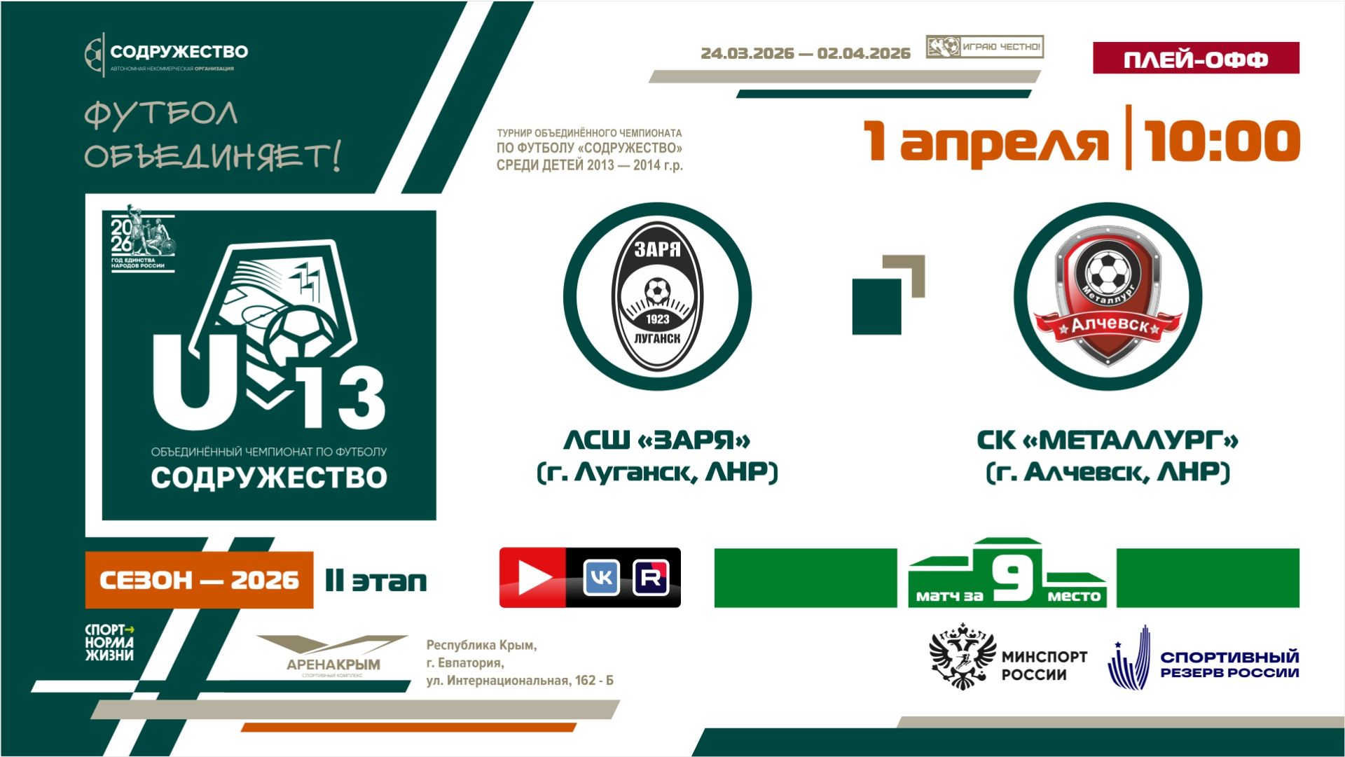 Игра за 9-ое место | ЛСШ «Заря» (г. Луганск, ЛНР) - СК "Металлург" (г. Алчевск, ЛНР) | 1.04.2026