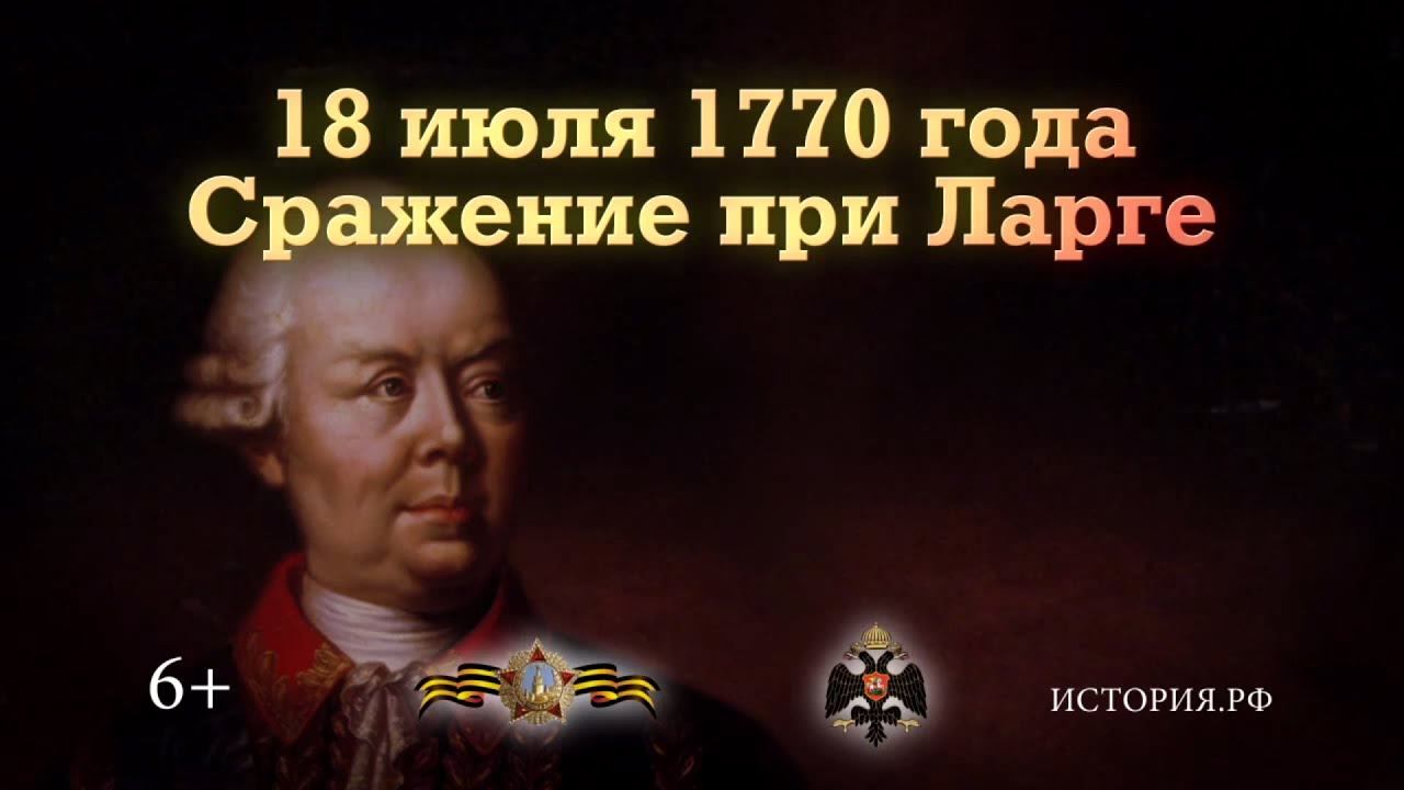 Памятная дата военной истории России Подробнее: http://histrf.ru/lenta-vremeni/event/view/srazhieniie-pri-larghie В этот день в 1770 году русская армия Петра Румянцева разгромила превосходившую в два раза по численности турецкую армию. За победу на реке Ларга, в нынешней Молдавии, Румянцев первым из военачальников был награжден орденом Святого Георгия I степени.
