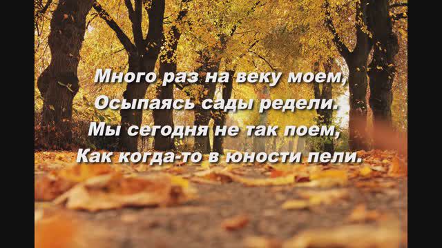Много раз на веку моем, Осыпаясь, сады редели. Мы сегодня не так поем, Как когда-то в юности пели. Осень ставит свою печать В этом временном нашем стане. Сердце будет еще стучать, Если это в Господнем плане. Вот опять загорелся сад Уже собраны груши и сливы, Перезрел на лозе виноград Изумрудные серьги с отливом. Посмотрите на эти сады Мы ведь тоже садам подобны., Можно жить до седой бороды, Каждый год, оставаясь бесплодным. Ах, боюсь я такой пустоты, Стать пред Богом с пустыми руками. Не всегда голубые цветы Могут осенью быть плодами. Много раз на веку моем, Осыпаясь, сады редели. Мы сегодня не так поем, Как когда-то в юности пели.