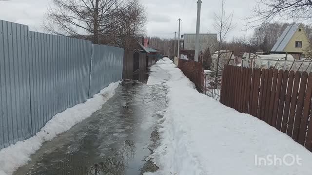На даче очень много снега. Вода стоит по колено. Теплица сломалась