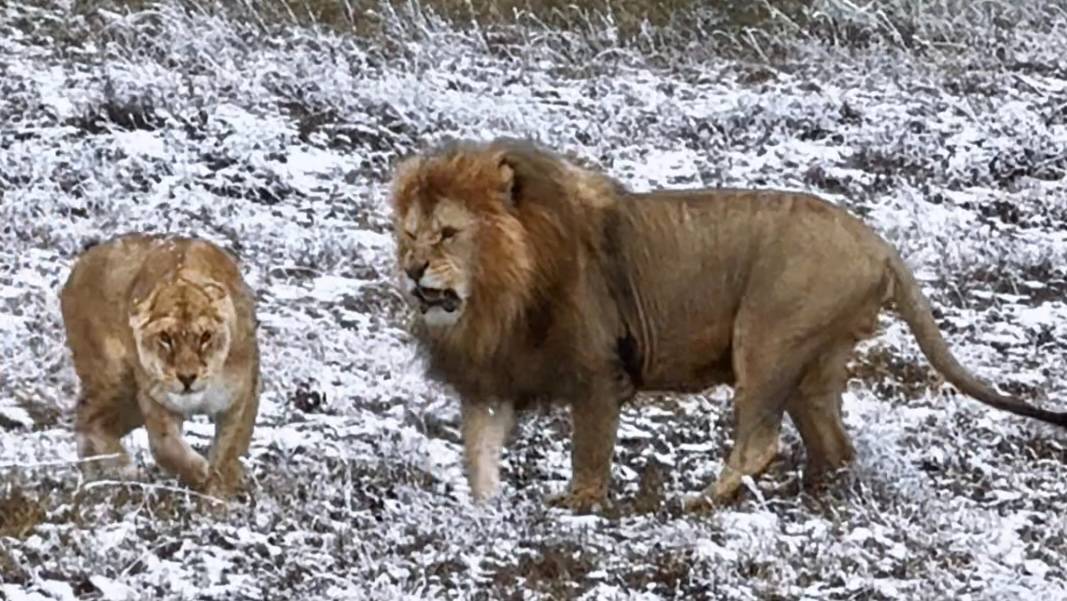 Лев гуляет, свою львицу не отпускает! Зима для львов не помеха! Романтические прогулки по снегу!